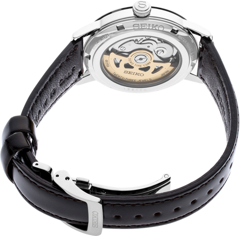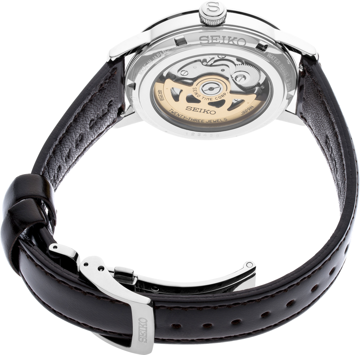 The Presage Collection by SEIKO combines mechanical excellence with sleek svelte design. Inspired by the glamorous jet-set cocktail bars of Tokyo with slim polished markers and delicate curved hands reminiscent of a martini glass. The SRPE41 features a gloss pressed pattern gradient mahogany red dial inspired by the Negroni cocktail reflecting off a cut crystal glass tumbler. The 41.7mm polished stainless steel case is powered by SEIKO's own 4R35 caliber movement with a see-through exhibition case-back and 41 hour power reserve. The faceted razor sharp hands with slim extra-long decorative tipped seconds hand are reminiscent of a cocktail stirrer. Stylized Arabic numerals fashioned like the lettering on vintage liquor bottles with date window @3 are surrounded by a minutes track. Fitted with a polished generous sized easy-grip stainless steel crown with 50 meter water resistance rating.  Finished with a smooth glossy brown calf-skin leather strap with matching stitch and polished stainless steel twin push button bi-fold deployment clasp to secure in place on the wrist.