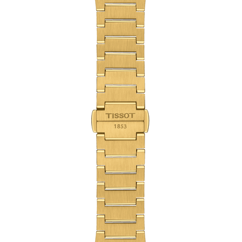 Part of the T-CLASSIC Collection, the PRX Series from the Tissot Watch Brand has sleek , smooth designs inspired by 1970's style, with modern innovations. The PRX Quartz Model #T137.210.33.021.00 has a brushed and polished 35mm gold-tone PVD coated stainless steel tonneau shaped case with a gold sun-brushed pattern dial. Applied luminous slim stick markers are surrounded by a minutes track. Luminous baton style hands and date window @3 are easily readable behind a circular scratch resistant anti-reflective sapphire crystal. Equipped with a polished ridged domed push-pull crown and 100 meter water resistance rating. Fitted with a brushed and polished gold-tone PVD coated stainless steel bracelet with bi-fold deployant safety clasp with Tissot emblem.