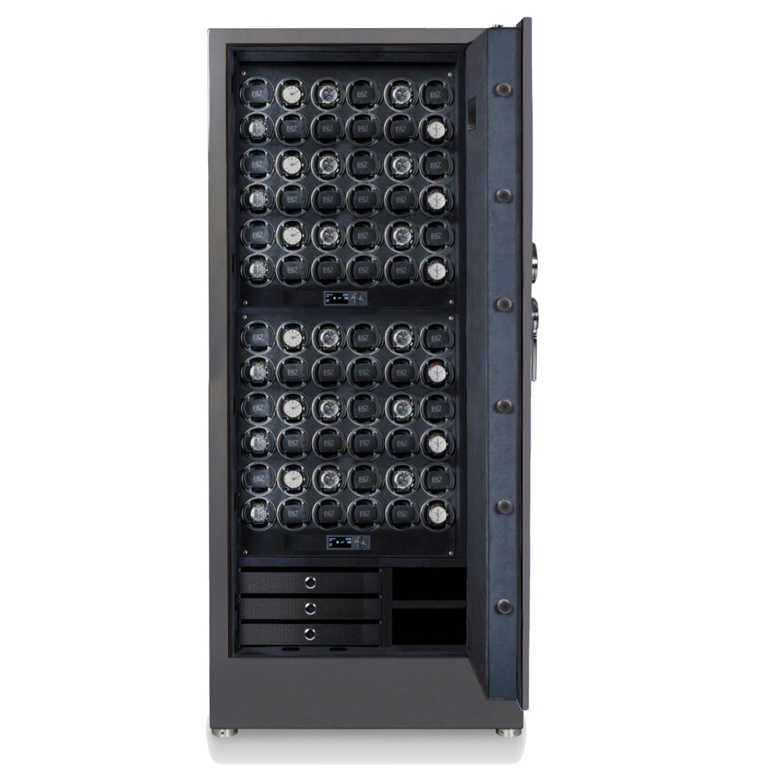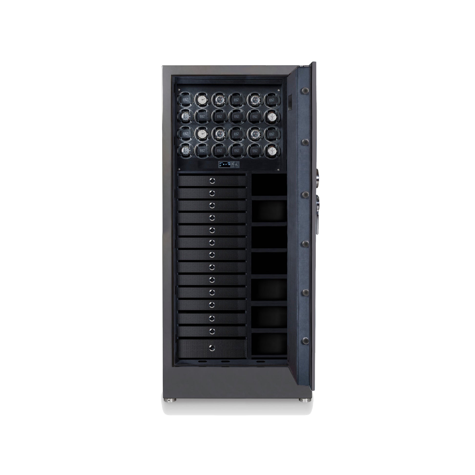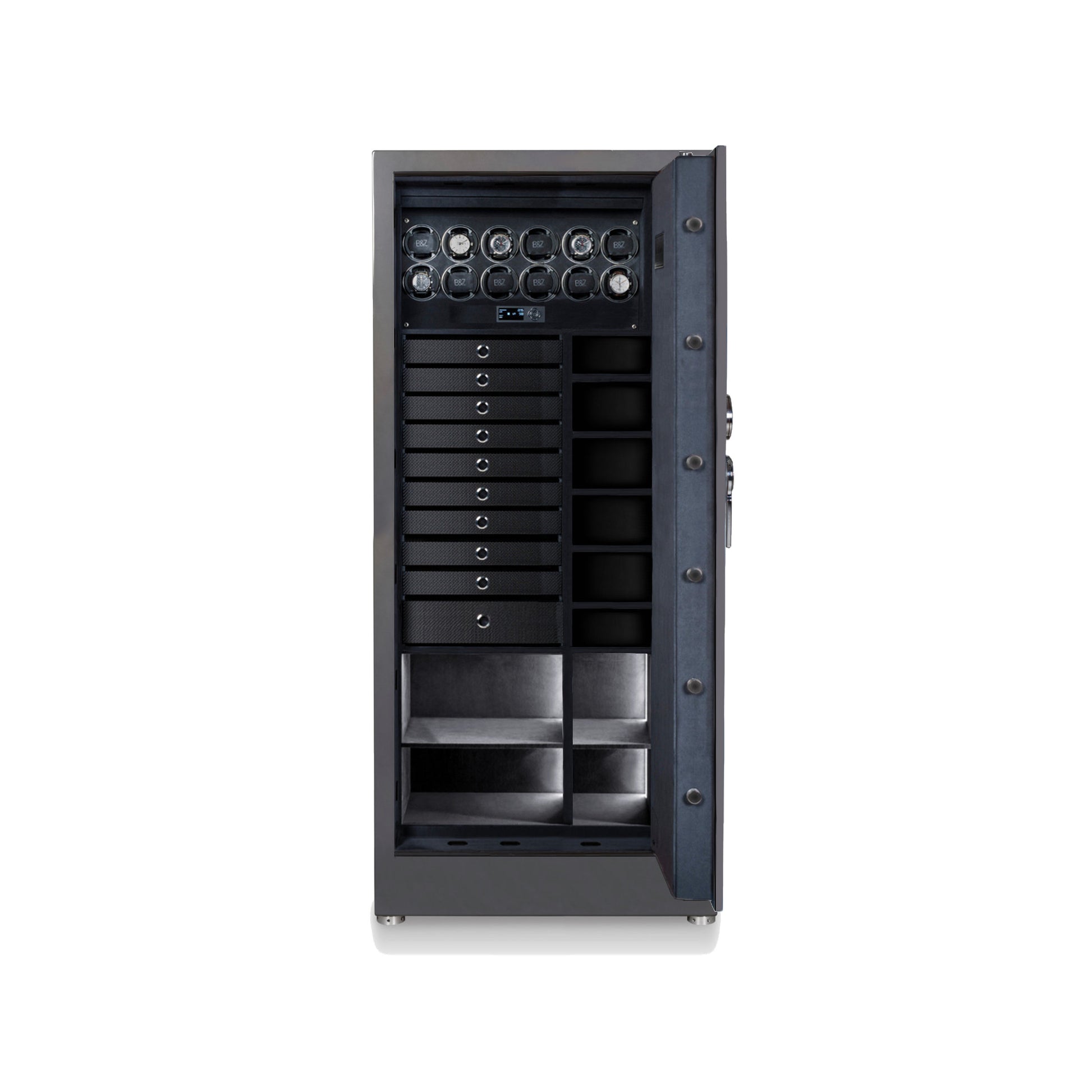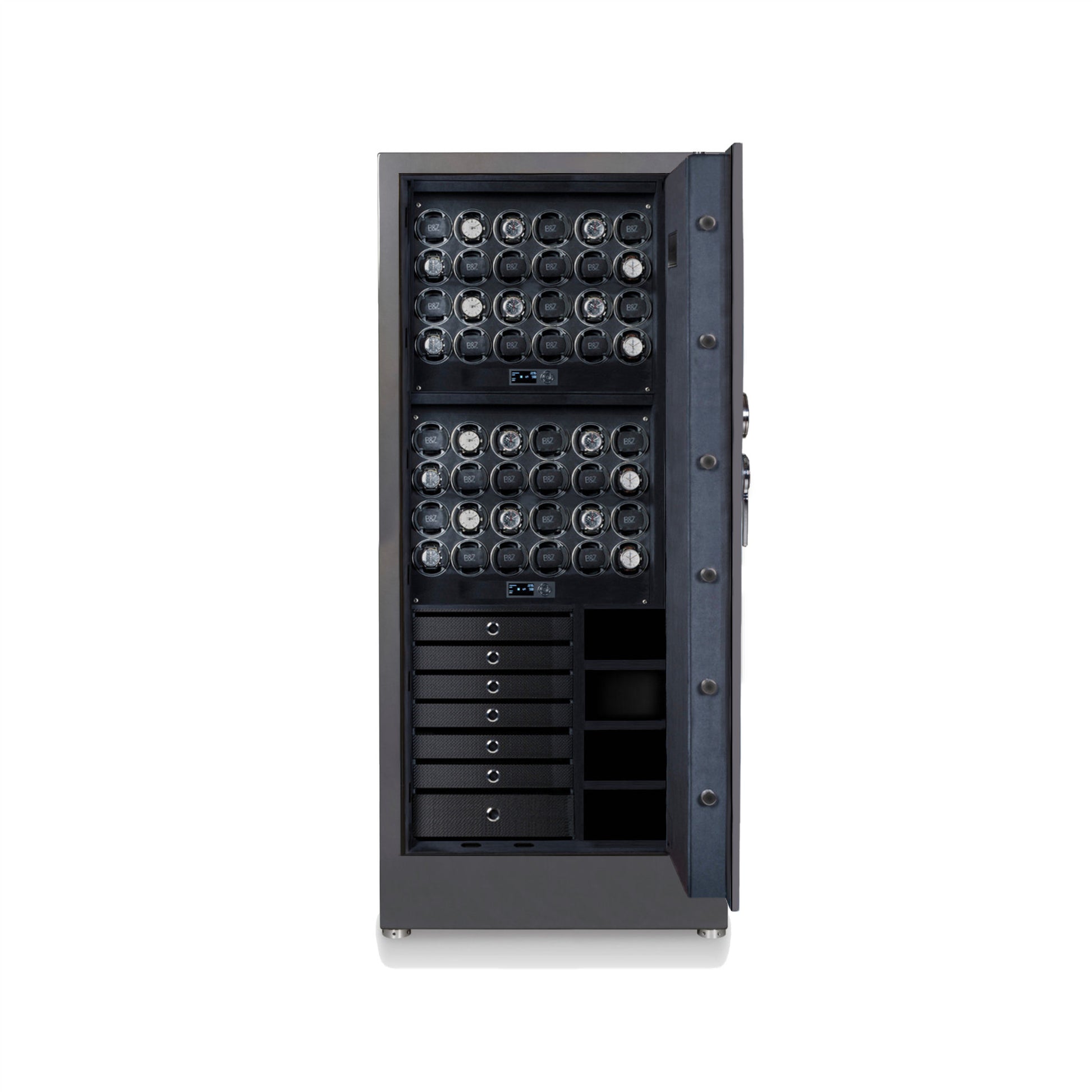 The SI-150 German certified VdS I security safe with redundant 7-digit keypad locking system with emergency key will keep items secure. Fitted with height adjusting stainless feet for your convenience. This piece can be customized to your specification of storage drawer components, TIME MOVER® winding units, lacquered colorstwo-tone options and metal colors, carbon fiber accents. You can upgrade the German security certification VdSI to a VdSIII penetration classification for an additional fee.