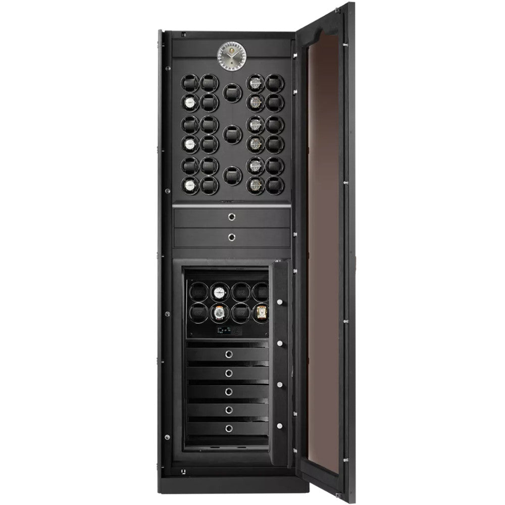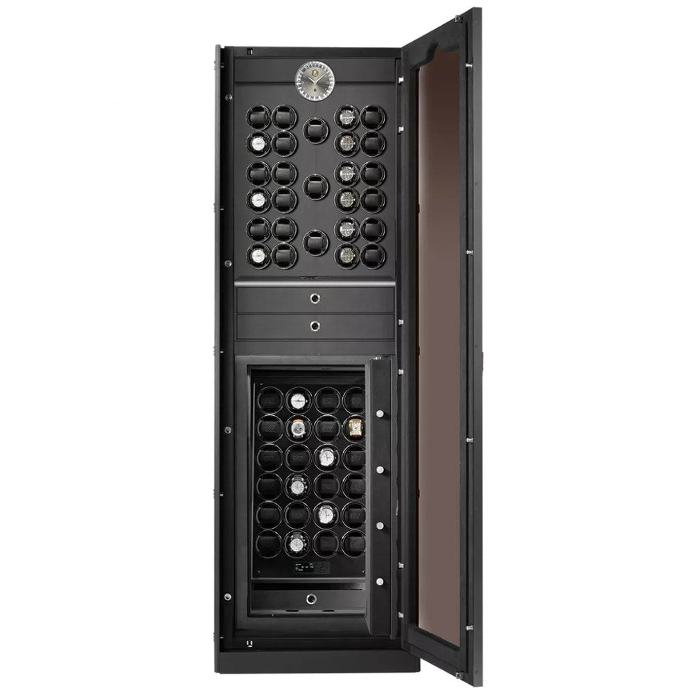 The cabinet is equipped with a two-way spy glass mirror door with remote controlled soft open locking mechanism. Featuring an LED lit BUBEN & ZÖRWEG Signature Clock with 27 TIME MOVER® winding units and two storage drawers with your choice of inserts. Lined in the finest plush velour's and leather interiors with state-of-the-art LED lighting system will beautifully illuminate your contents. Fitted with an inner SI-80 German certified VdS I class safety rating security safe with redundant 7-digit keypad locking system and emergency back-up key will keep additional items secure. With an interior of 8,16 or 24 more watch winders and 8, 6, 4 or 9 (no winders) storage drawers there is plenty of room for jewelry, watches and precious treasures.  Additional add-on features offered include Hi-Fi System, exterior biometric fingerprint or keypad lock, bullet-proof glass, alarm system, and GPS tracking system. This piece can be customized to your specification of interior storage drawer components and TIME MOVER® winding units.