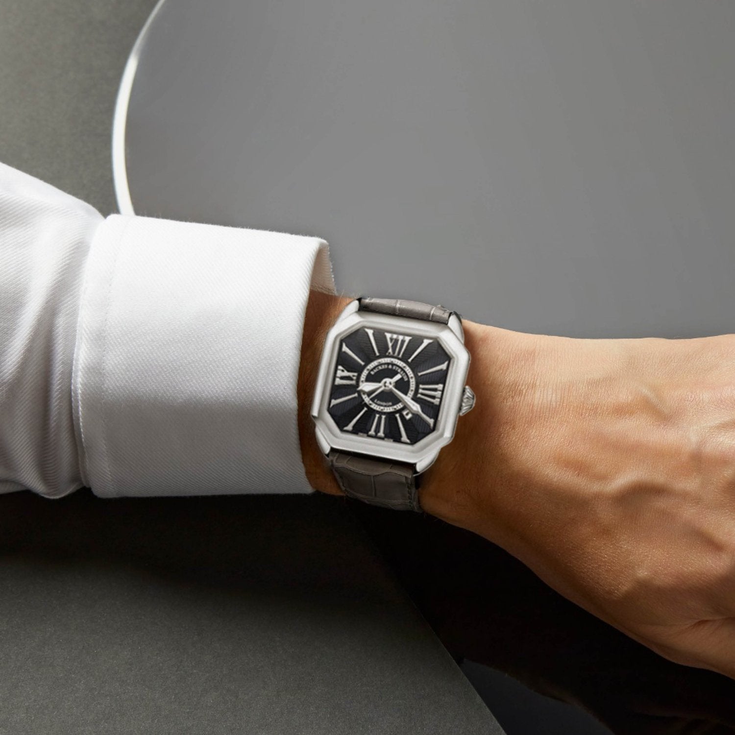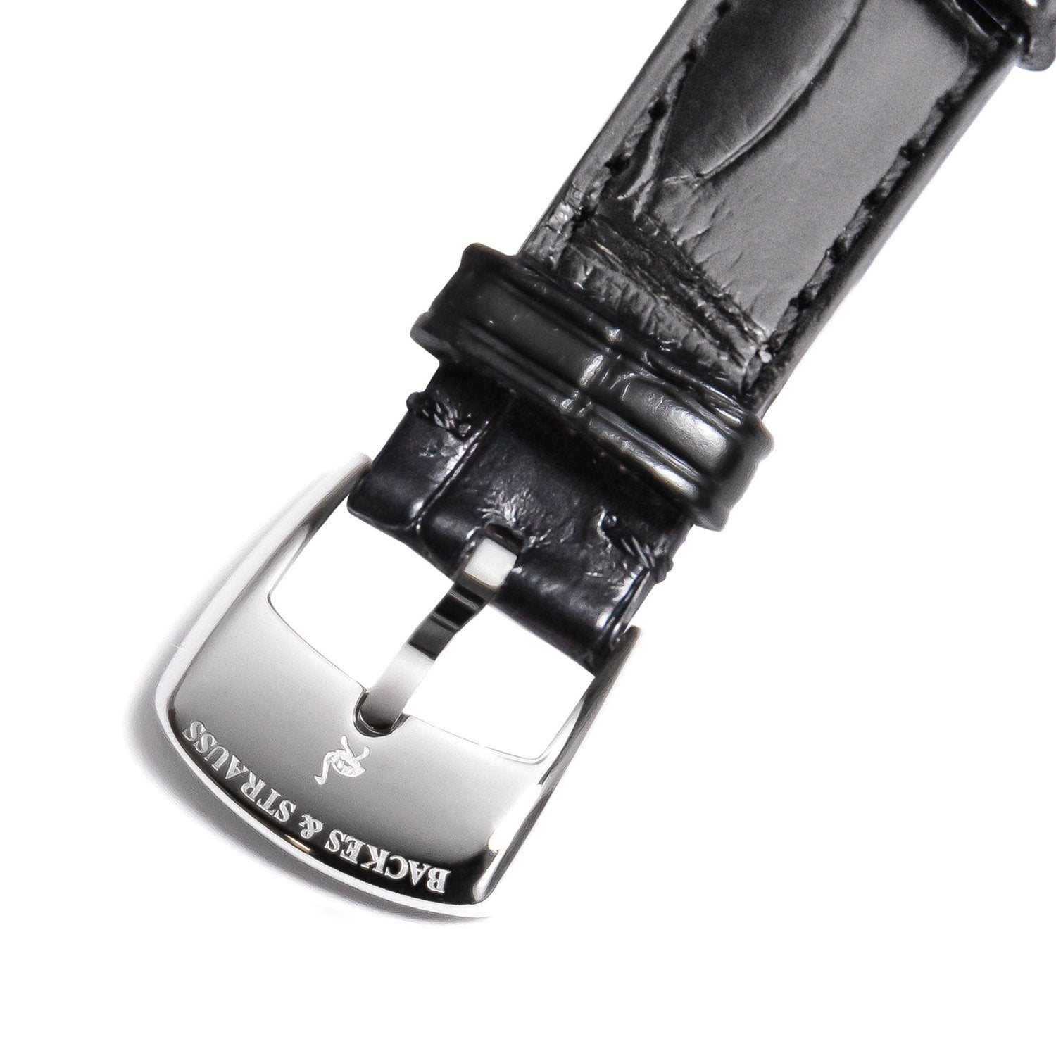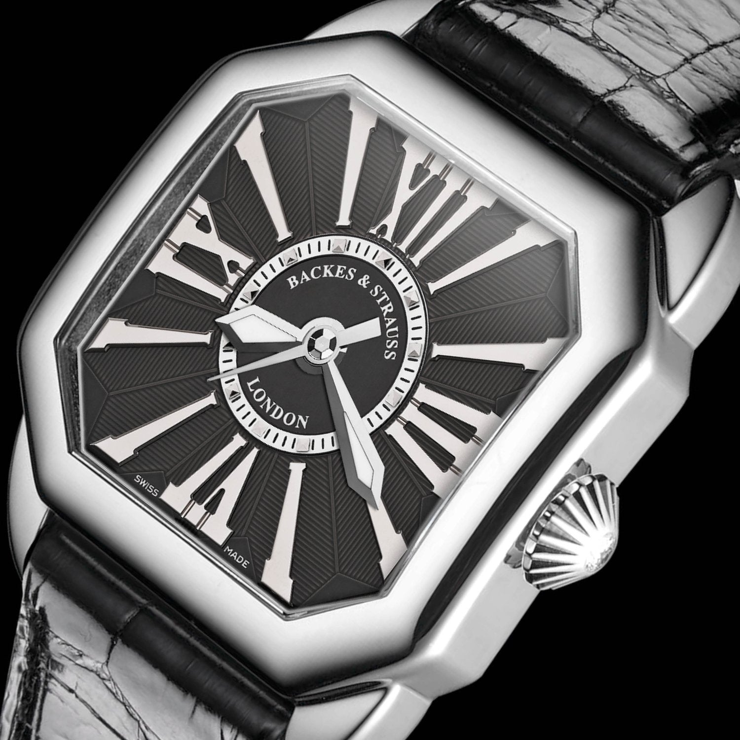 Handcrafted in Switzerland from the Frank Muller Group, the Berkeley Watch Collection by the Backes & Strauss Brand is inspired by one of London's most popular districts of Mayfair, Berkely Square and its symmetrical landscapes. The automatic octagon shaped 40mm case has a polished stainless steel contoured bezel with cabochon signature jewel tipped diamond crown insert. The black geometric textured patterned dial represents the ideal cut diamond shape under an anti-reflective sapphire crystal.  Luminous diamond shaped hands are surrounded by hand-polished applied oversized curved indices and Roman numerals. A small date window is set within a minutes track accented with polished diamond shaped apertures on the inner dial disc. Powered by an automatic Swiss-made caliber platinum movement with a 42 hour power reserve and 30 meter water resistance rating. Finished with a glossy black alligator leather strap with matching stitch and polished stainless steel tang buckle with Backes & Strauss emblem.