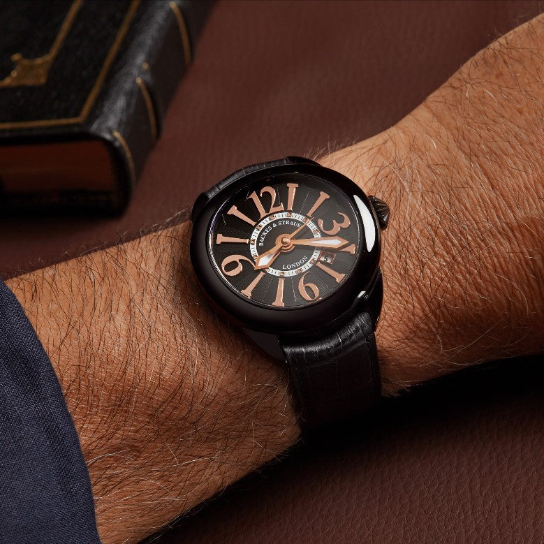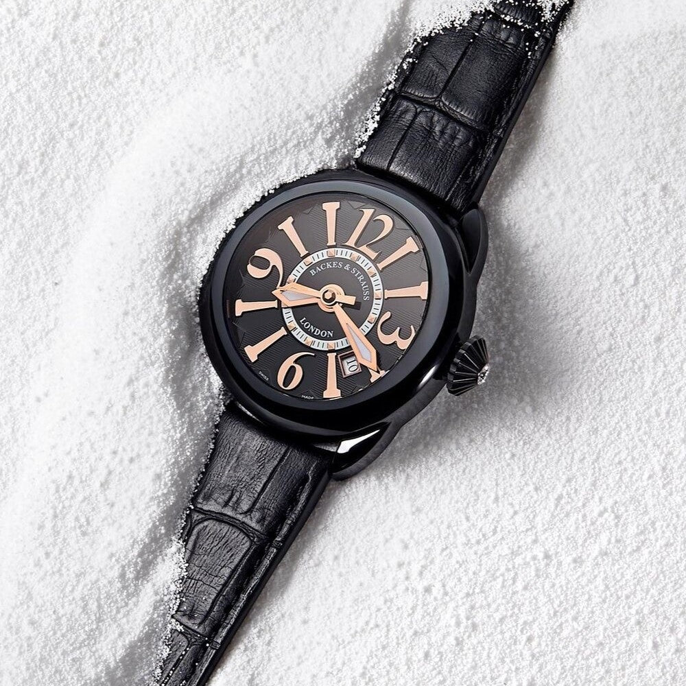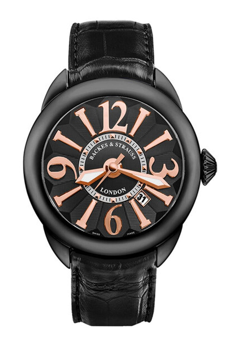 Handcrafted in Switzerland from the Frank Muller Group, the Piccadilly Watch Collection by the Backes & Strauss Brand is inspired by London's great epicenter of the grand circular junctions neighborhoods combining timelessness with modern interpretated elegance of the Regency of England. The automatic curved and circular shaped 40mm case has a black PVD coated polished stainless steel bezel with conical shaped cabochon signature jewel tipped diamond crown insert. The black geometric textured patterned dial represents the ideal cut diamond shape under an anti-reflective sapphire crystal.  Luminous diamond shaped hands are surrounded by hand-polished applied oversized curved indices and Arabic numerals. A minutes track is accented with polished diamond shaped apertures on the inner dial disc. Powered by an automatic Swiss-made caliber platinum movement with a 42 hour power reserve and 30 meter water resistance rating. Finished with a black alligator leather strap with matching stitch and polished stainless steel tang buckle with Backes & Strauss emblem.
