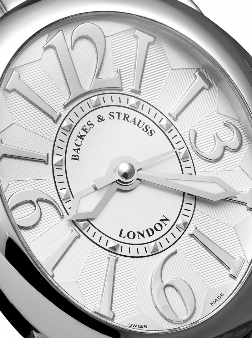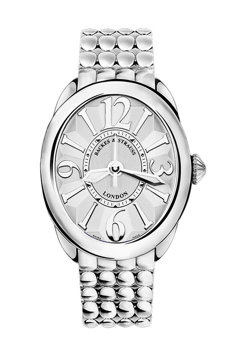 Handcrafted in Switzerland from the Frank Muller Group, the Regent Watch Collection by the Backes & Strauss Brand is inspired by the architect John Nash who was commissioned by Prince Regent to design and construct neoclassical architecture of 19th century London, England in the 1800's. The automatic curved and oval shaped case has a polished stainless steel bezel with conical shaped cabochon signature jewel tipped diamond crown insert. The silver geometric textured patterned dial represents the ideal cut diamond shape under an anti-reflective sapphire crystal.  Luminous diamond shaped hands are surrounded by hand-polished applied oversized curved indices and Arabic numerals. A minutes track is accented with polished diamond shaped apertures on the inner dial disc. Powered by an automatic Swiss-made caliber platinum movement, with a 42 hour power reserve and 30 meter water resistance rating. Finished with a grains of rice polished stainless bracelet with bi-fold double push button clasp closure with Backes & Strauss insignia.