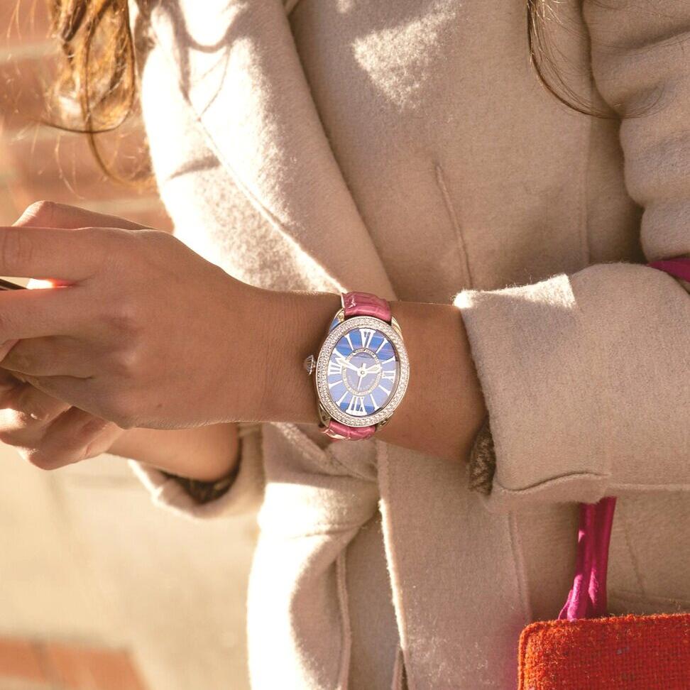 Handcrafted in Switzerland from the Frank Muller Group, the Regent Watch Collection by the Backes & Strauss Brand is inspired by the architect John Nash who was commissioned by Prince Regent to design and construct neoclassical architecture of 19th century London, England in the 1800's. The automatic curved and oval shaped case has a polished stainless steel diamond encrusted bezel with conical shaped cabochon signature jewel tipped diamond crown insert. The brilliant royal blue geometric textured patterned dial represents the ideal cut diamond shape under an anti-reflective sapphire crystal.  Luminous diamond shaped hands are surrounded by hand-polished applied oversized curved indices and Roman numerals. A minutes track is accented with polished diamond shaped apertures on the inner dial disc. Powered by an automatic Swiss-made caliber platinum movement, with a 42 hour power reserve and 30 meter water resistance rating. Finished with a glossy light purple fuchsia alligator leather strap with matching stitch and polished stainless steel tang buckle with Backes & Strauss emblem.