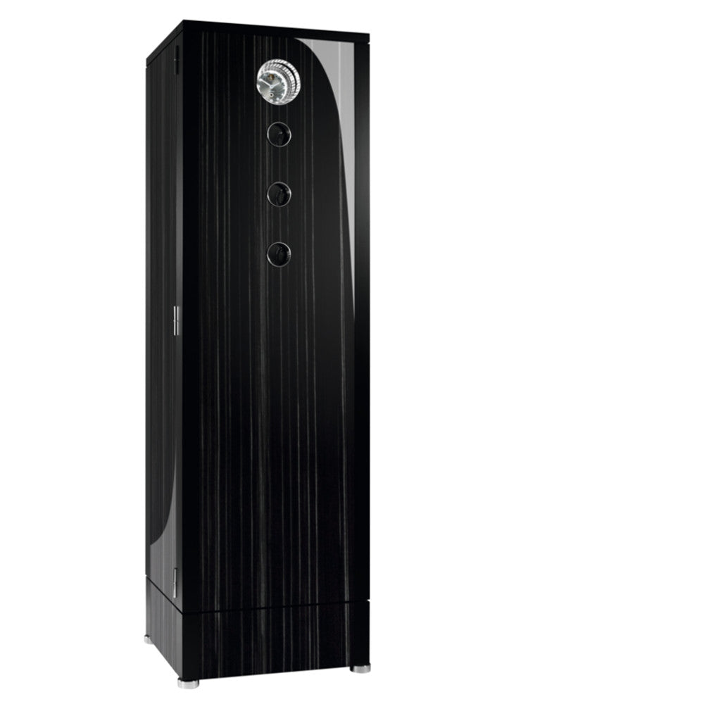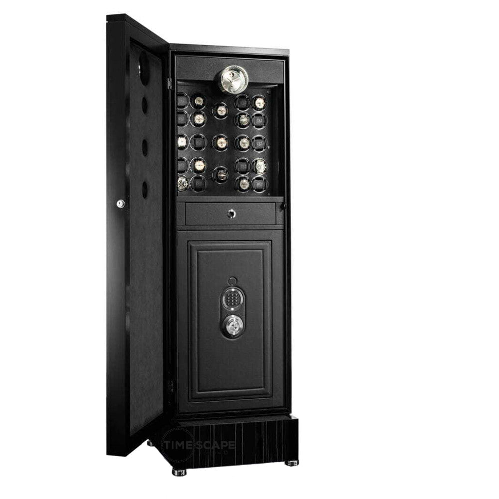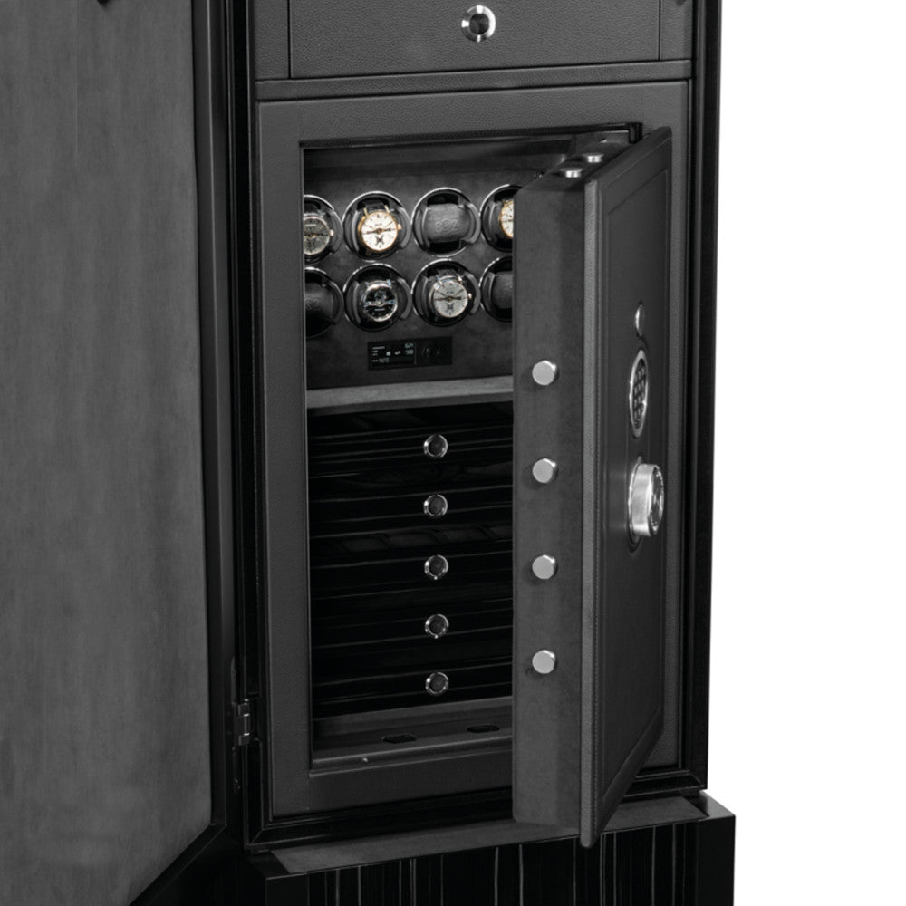 The COLLECTOR Deluxe features an LED lit BUBEN & ZÖRWEG signature clock with 2-way mirrored transparent portholes to reveal the contents at your discretion. Made of exotic high-gloss ebony  grigio woods within a piano black frame and polished stainless steel hardware. Interiors of soft plush velours and a safe covered in genuine Italian Nappa leathers with storage drawers will secure additional watches and jewelry. Equipped with 23 TIME MOVER® watch winding units, large storage drawer, and a certified SI-80 German security safe. Additional winding units are inside the security safe include 8,16 or 24 watch winders with various drawer configurations according to which unit you choose. An LCD control panel will program your winding system with state of the art LED lighting system with fade function to beautifully illuminate its contents. Fitted with height adjusting stainless steel feet for your convenience and additional add-on features offered include alarm system and GPS tracking systems. This item can be customized with exterior finishes, number of winding units, drawer inserts and colored leather interiors, call 1-888-525-8880 for more info.