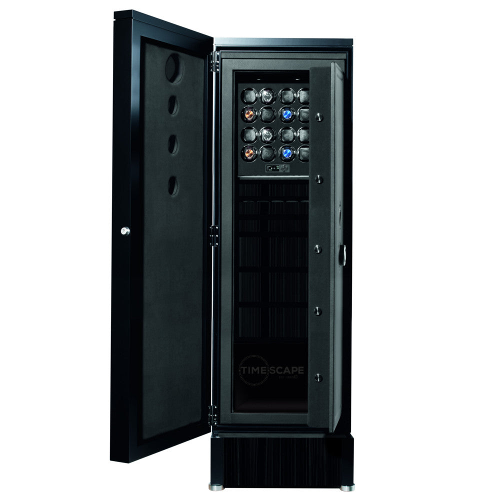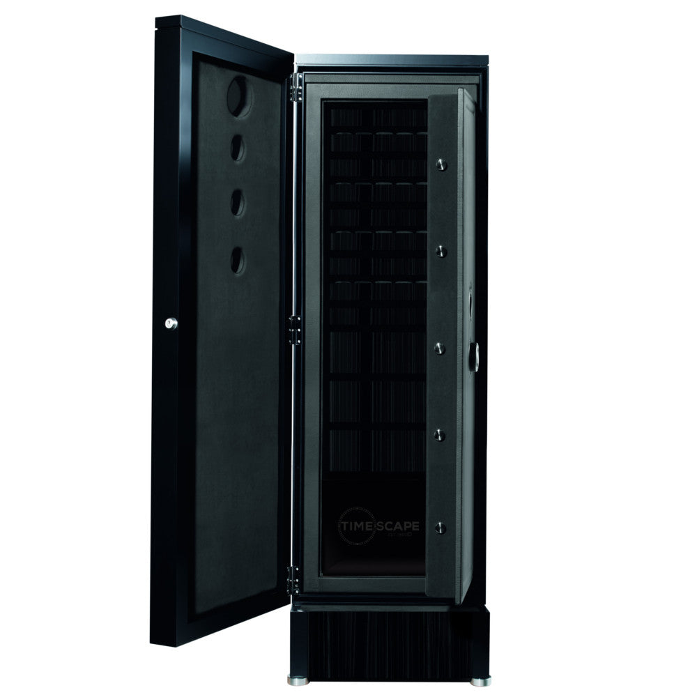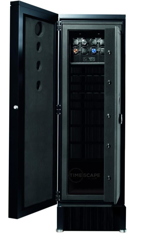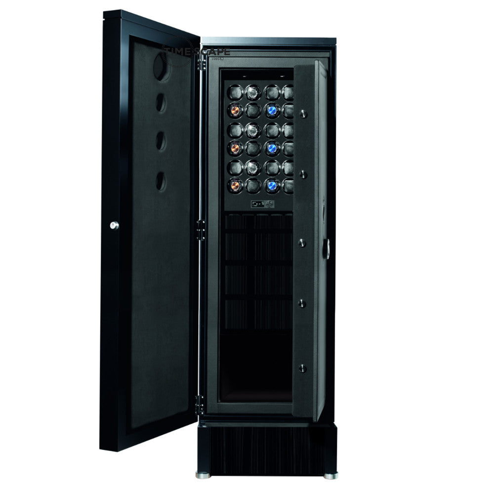 The COLLECTOR XXL features 2-way mirrored transparent portholes within an exterior of exotic high-gloss ebonty grigio woods and piano black frame. Your contents are safe inside the certified SI-150 security safe with redundant 7-digit keypad locking system and emergency mechanical back-up key. Interiors of soft plush velours and genuine Italian Nappa leathers with storage drawers are accented with polished chrome hardware. Equipped with 8,16 or 24 TIME MOVER® watch winding units, and various drawer configurations of your choice according to which unit you choose. An LCD control panel will program your winding system with a  state of the art LED lighting system with fade function to beautifully illuminate your products. Fitted with height adjusting stainless steel feet for your convenience with optional add-on security features such as an alarm system and GPS tracking systems. This item can be customized with exterior finishes, number of interior winding units, drawer inserts and colored leather interiors, call 1-888-525-8880 for more info. You can upgrade the German security certification VdSI to a VdSIII penetration classification for an additional fee.