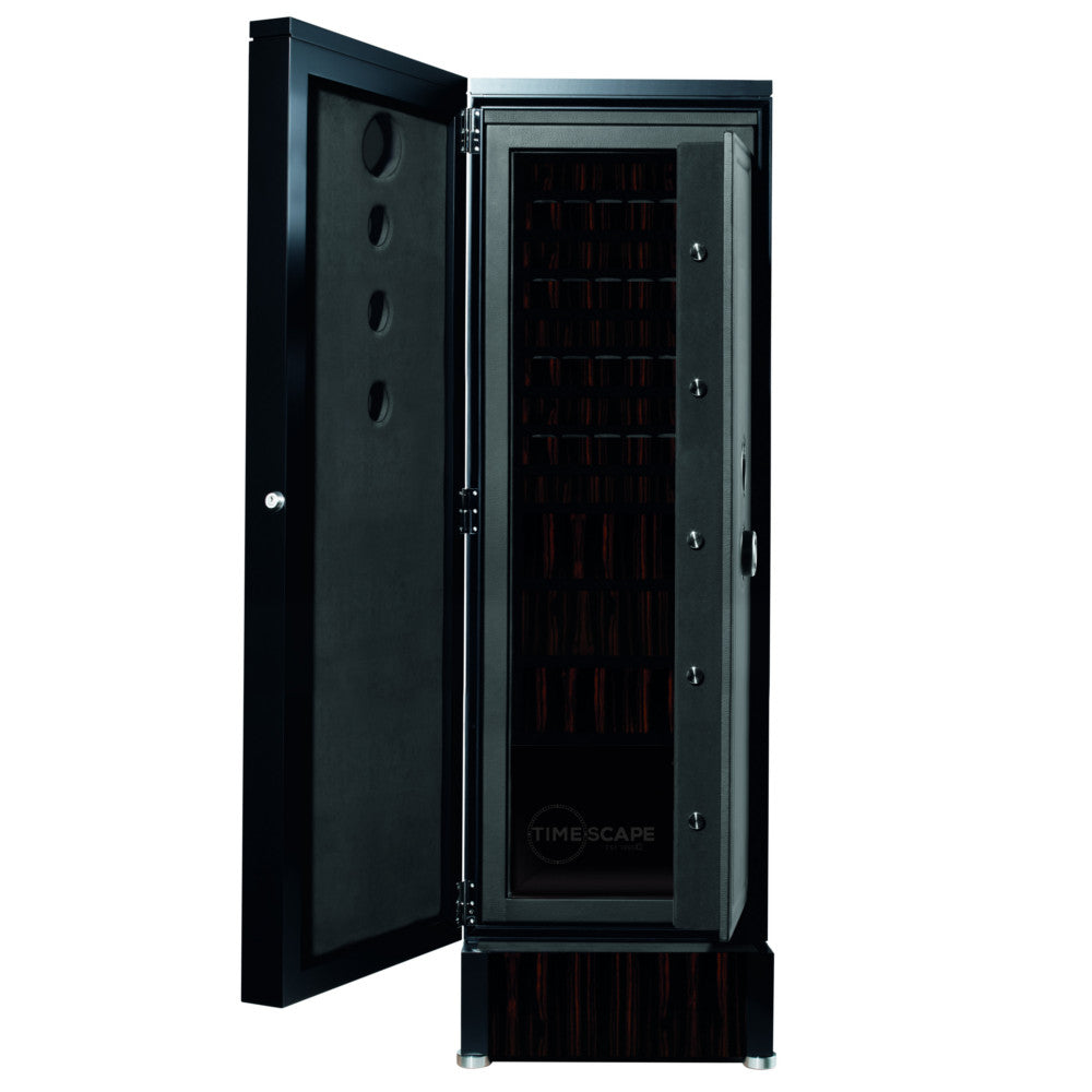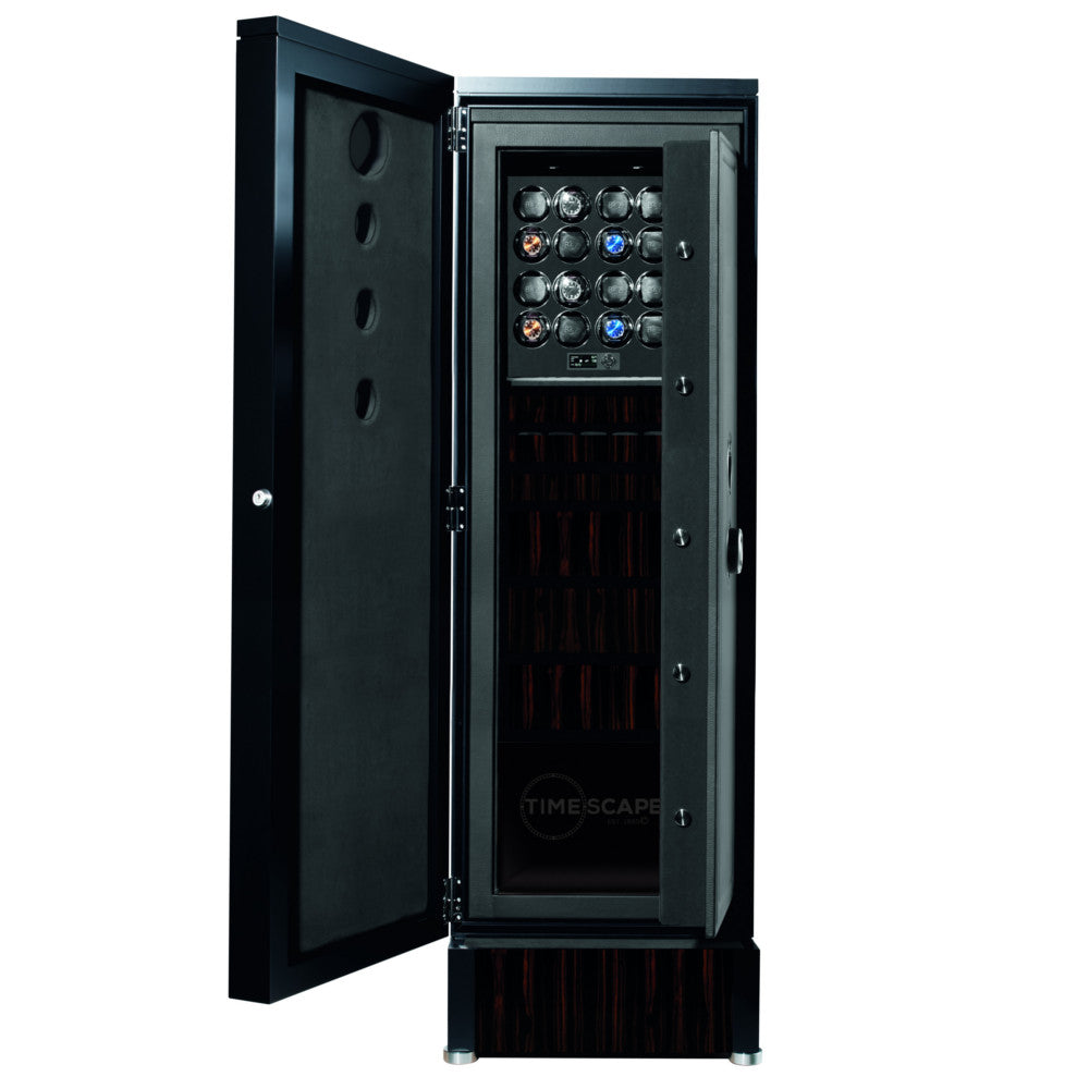 The COLLECTOR XXL features 2-way mirrored transparent portholes within an exterior of exotic high-gloss macassar woods and piano black frame. Your contents are safe inside the certified SI-150 security safe with redundant 7-digit keypad locking system and emergency mechanical back-up key. Interiors of soft plush velours and genuine Italian Nappa leathers with storage drawers are accented with polished chrome hardware. Equipped with 8,16 or 24 TIME MOVER® watch winding units, and various drawer configurations of your choice according to which unit you choose. An LCD control panel will program your winding system with a  state of the art LED lighting system with fade function to beautifully illuminate your products. Fitted with height adjusting stainless steel feet for your convenience with optional add-on security features such as an alarm system and GPS tracking systems. This item can be customized with exterior finishes, number of interior winding units, drawer inserts and colored leather interiors, call 1-888-525-8880 for more info. You can upgrade the German security certification VdSI to a VdSIII penetration classification for an additional fee.