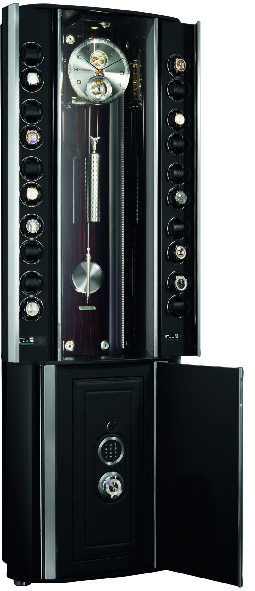 The Grand Infinity winding system is hand-crafted with lluxurious black semi-gloss exterior finish and glossy precious burlwood inlays. A polished LED lit high precision BUBEN & ZORWEG pendulum clock gives a grand and impressive appearance on display behind non-reflective glass. The interior has the finest plush velour and slide and swing doors that conceal 10 TIMEMOVER winding units (10 on each door) operated via remote control. The state of the art LED lighting system will beautifully illuminate your watch collection with a fade out function for impressive effect.