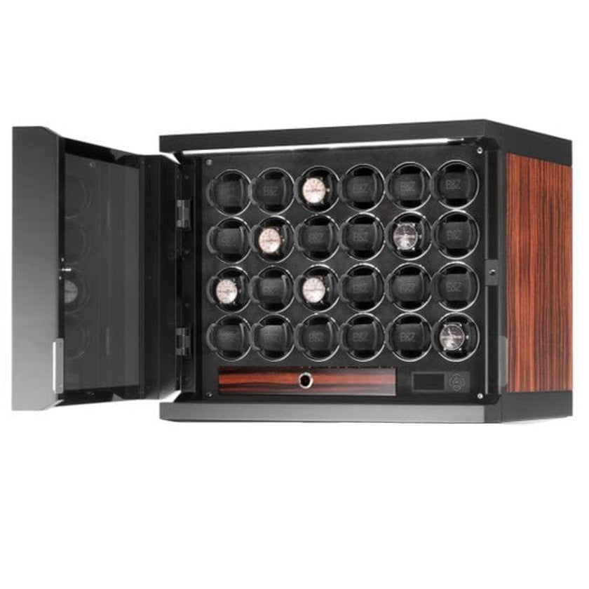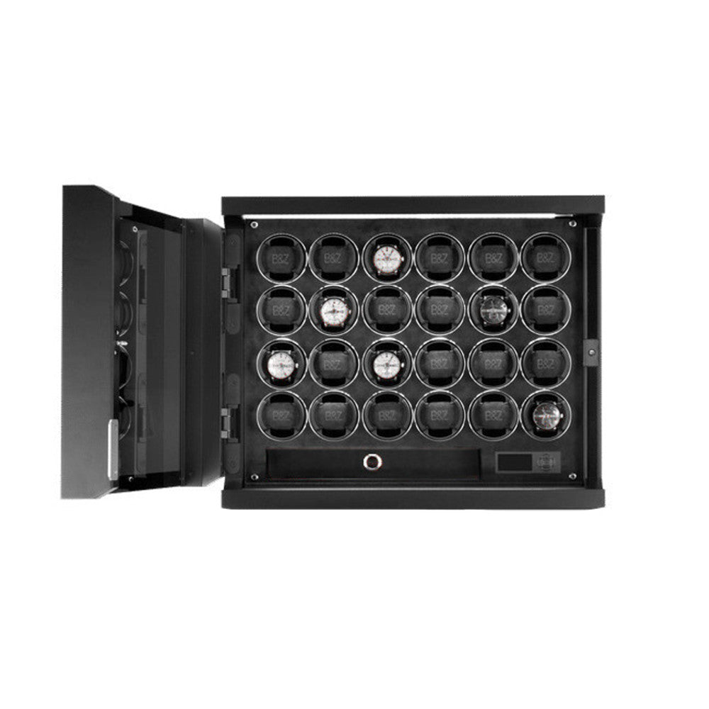 Made with perfect German craftsmanship, the GUARDIAN from the house of BUBEN & ZÖRWEG, is a prestigious watch winding and lockable storage unit to secure and protect your most coveted timepieces. Available in a variety of configurations and sizes, the GUARDIAN will house 16, or 24 watch winders with 1 storage drawer or 2 side compartment spaces (depending on what model you choose) for additional watches.  Housed in glossy macassar woods or sleek carbon fiber exteriors accented with high gloss piano wood finish and with interiors of soft velours. Equipped with a two-way mirrored glass door that is fully transparent to impressively reveal at your discretion, the contents within. A state of the art LED lighting system will beautifully illuminate your collection with a fade out function for impressive effect. Your watch collection will be safe and secure behind a lockable 8 mm thick safety glass door with specialty made German security lock. For additional protection choose the S-40 safe option or add-on features such as a presentation table, alarm system or GPS tracking system.
