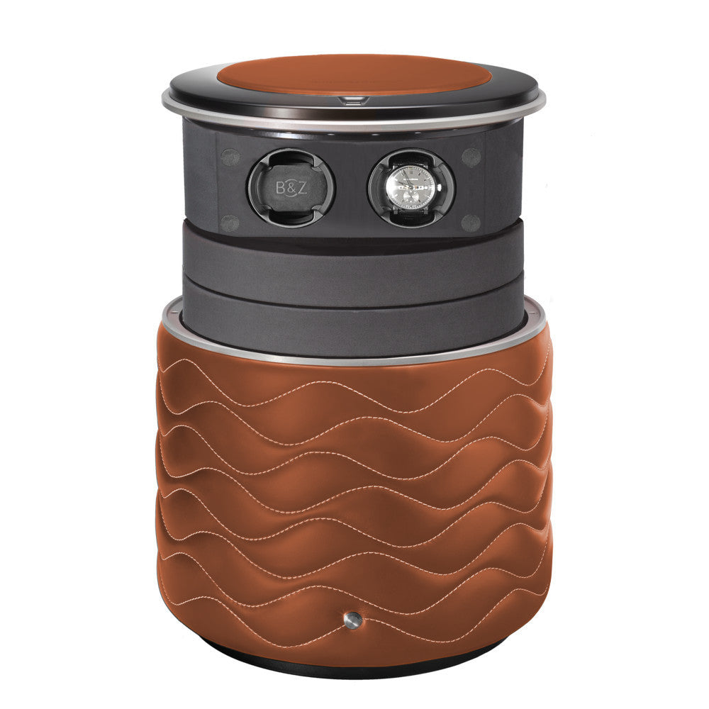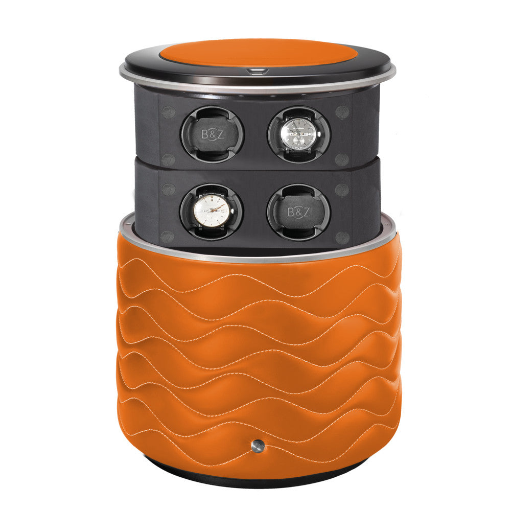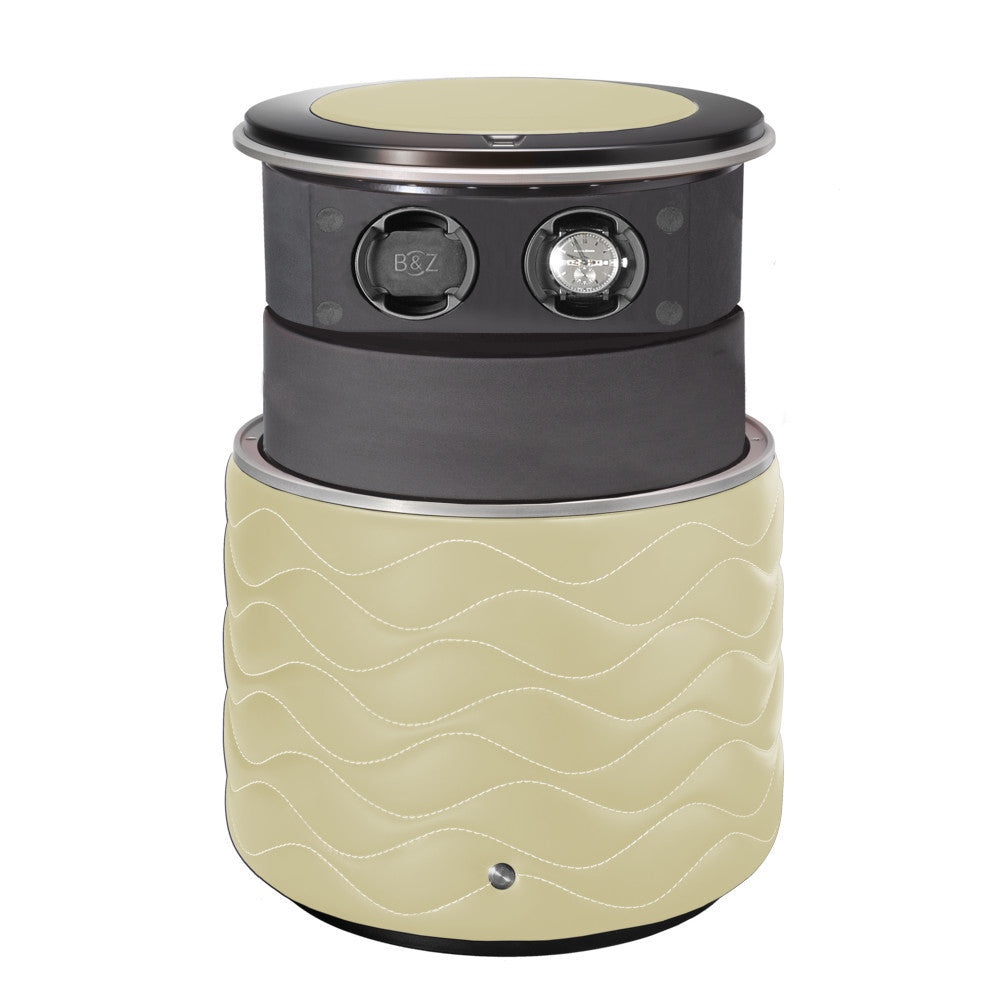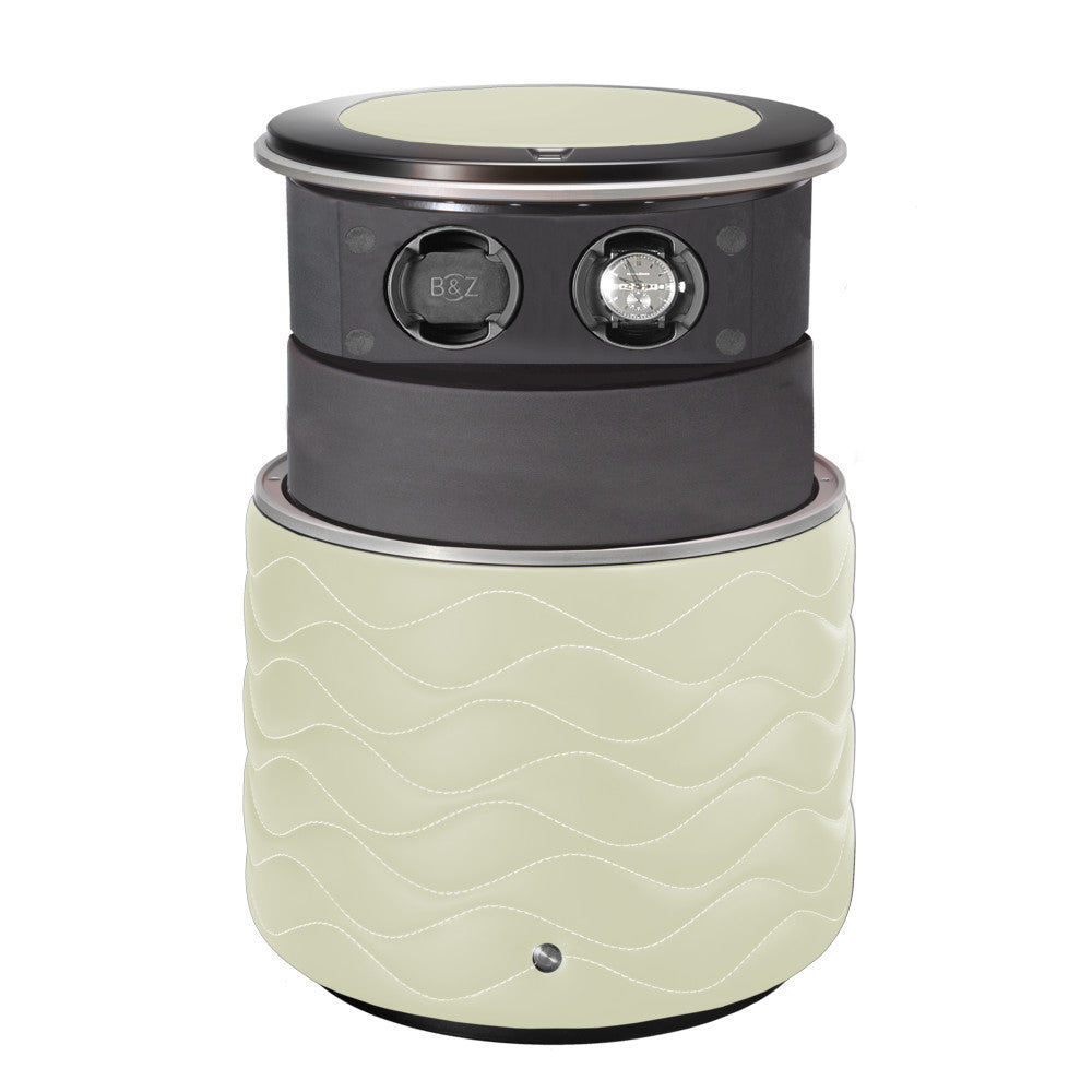 The ILLUSION Collection from the prestigious House of BUBEN & ZÖRWEG, is a compact concealed watch winding and storage system. The ottoman shaped unit is designed as a stand alone piece to fit effortlessly in any interior. Your valuables are hidden within and accessible behind an innovative opening mechanism that elevates via fingerprint sensor technology.  The padded exterior is hand-crafted in the finest Italian Nappa leathers with decorated patterned matching stitch. The interior is lined in luxurious plush velour with state-of-the-art LED lighting system to beautifully illuminate your collection. You choose your choice of interior components of up to 4 watch winders (no drawers) and/or two sizes of storage drawers according to which combination you choose. With two levels of storage and two options for drawer inserts, (cufflink or universal tray) the pivoting drawers give easy and convenient access to your valuables.