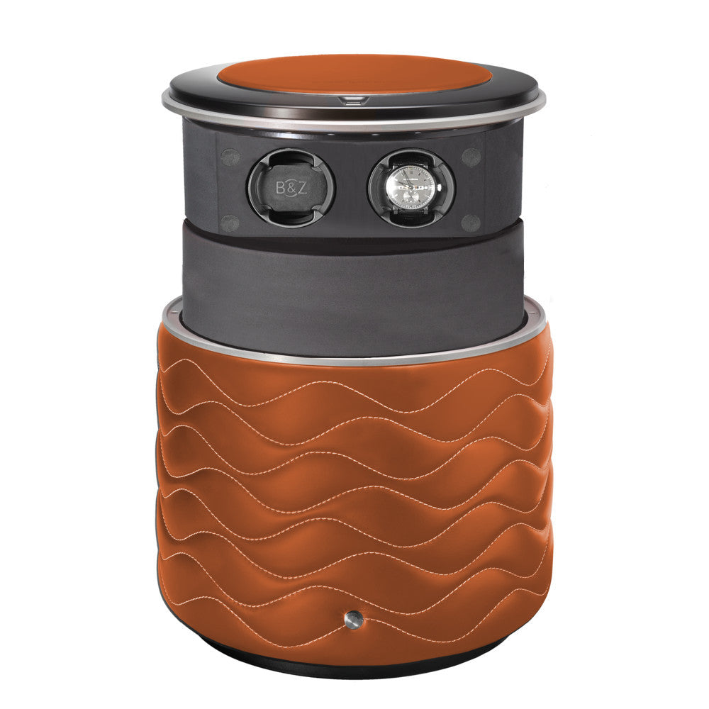 The ILLUSION Collection from the prestigious House of BUBEN & ZÖRWEG, is a compact concealed watch winding and storage system. The ottoman shaped unit is designed as a stand alone piece to fit effortlessly in any interior. Your valuables are hidden within and accessible behind an innovative opening mechanism that elevates via fingerprint sensor technology.  The padded exterior is hand-crafted in the finest Italian Nappa leathers with decorated patterned matching stitch. The interior is lined in luxurious plush velour with state-of-the-art LED lighting system to beautifully illuminate your collection. You choose your choice of interior components of up to 4 watch winders (no drawers) and/or two sizes of storage drawers according to which combination you choose. With two levels of storage and two options for drawer inserts, (cufflink or universal tray) the pivoting drawers give easy and convenient access to your valuables.