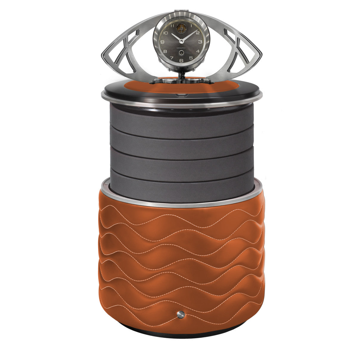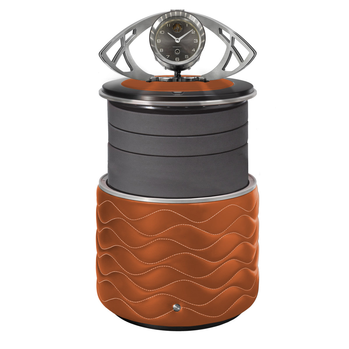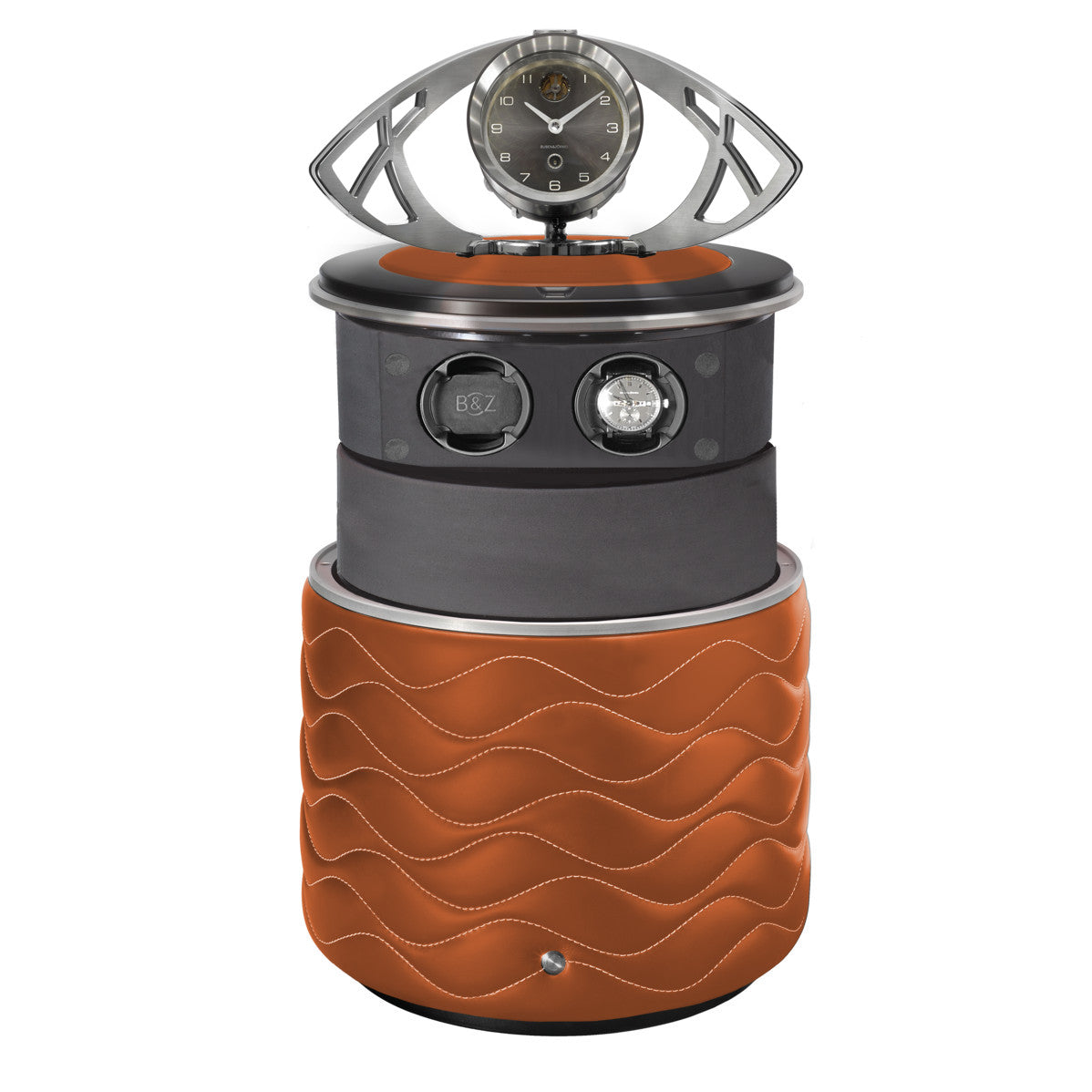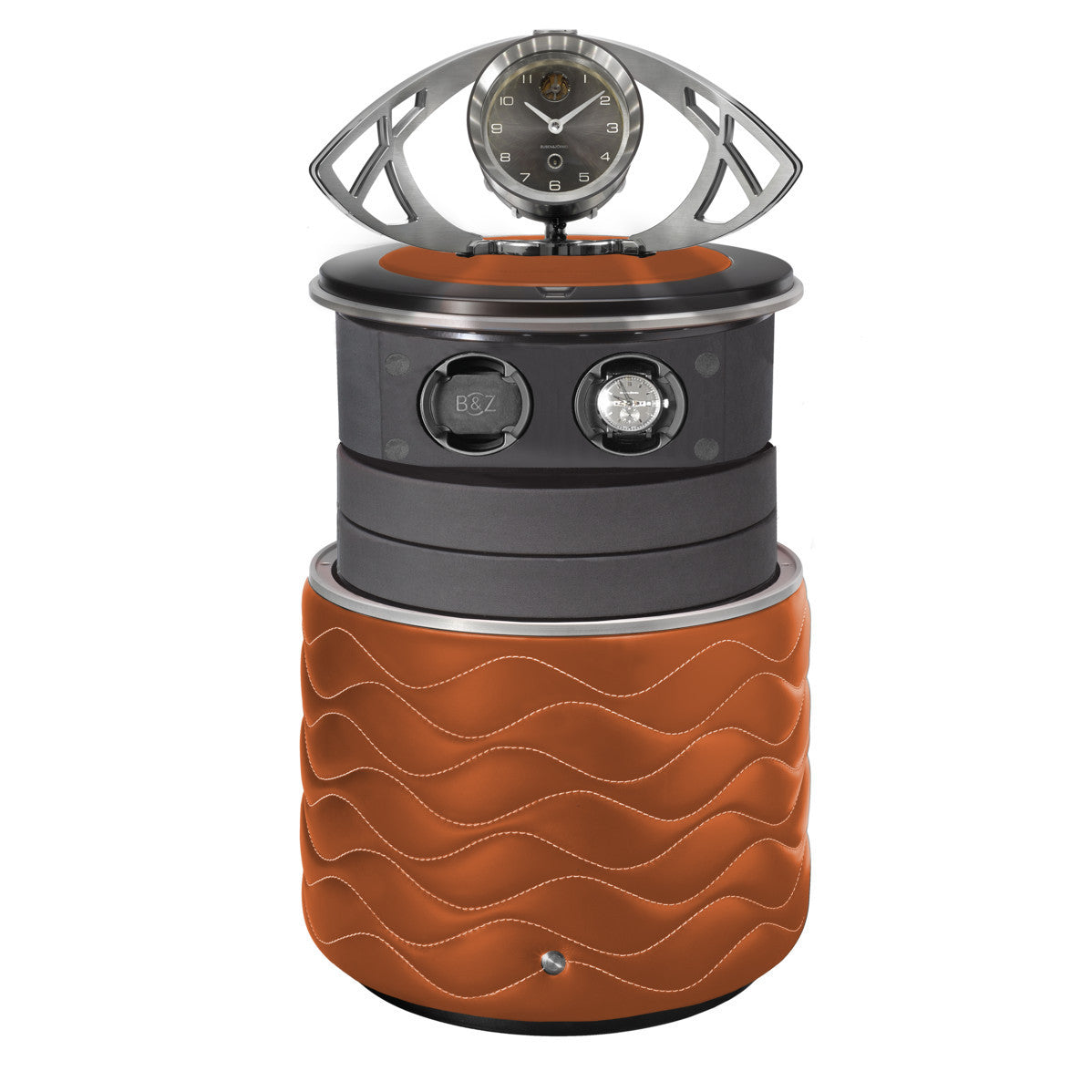 The DELUXE version of the ILLUSION Collection from the prestigious House of BUBEN & ZÖRWEG, is a compact concealed watch winding and storage system. The ottoman shaped unit is designed as a stand alone piece to fit effortlessly in any interior fitted with a BUBEN & ZÖRWEG signature clock showcased on top as an presentational ornamental piece. Your valuables are hidden within and accessible behind an innovative opening mechanism that elevates via fingerprint sensor technology.  The padded exterior is hand-crafted in the finest Italian Nappa leathers with decorated patterned matching stitch. The interior is lined in luxurious plush velour with state-of-the-art LED lighting system to beautifully illuminate your collection. You choose your choice of interior components of up to 4 watch winders (no drawers) and/or two sizes of storage drawers according to which combination you choose. With two levels of storage and two options for drawer inserts, (cufflink or universal tray) the pivoting drawers give easy and convenient access to your valuables.