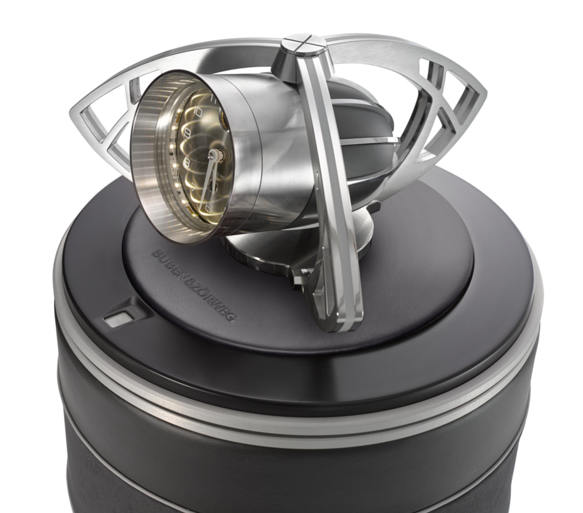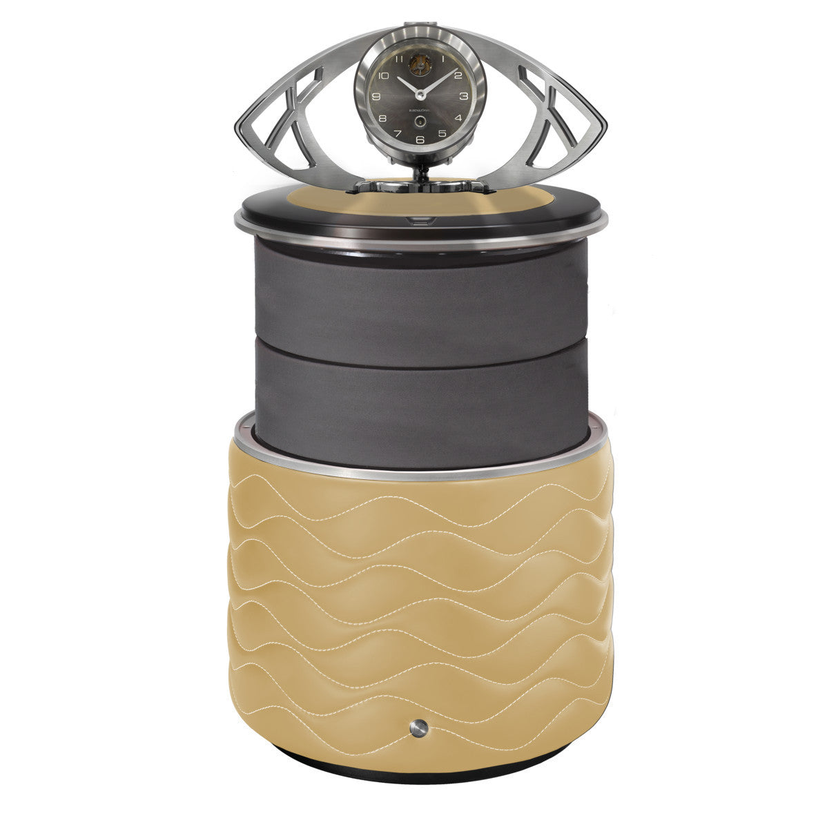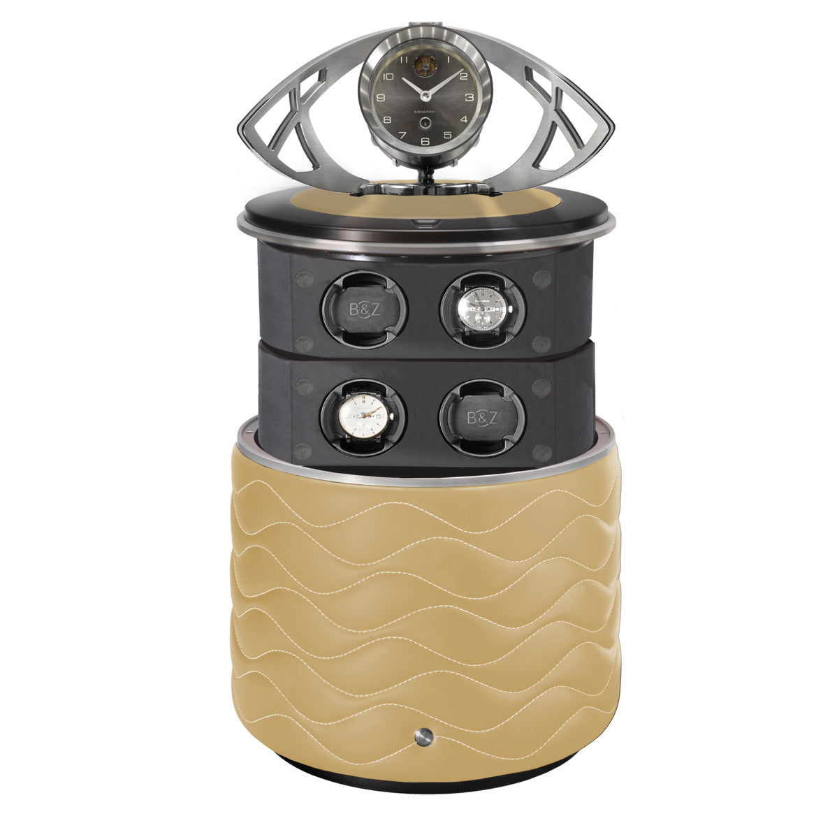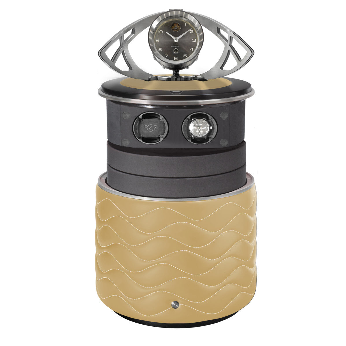 The DELUXE version of the ILLUSION Collection from the prestigious House of BUBEN & ZÖRWEG, is a compact concealed watch winding and storage system. The ottoman shaped unit is designed as a stand alone piece to fit effortlessly in any interior fitted with a BUBEN & ZÖRWEG signature clock showcased on top as an presentational ornamental piece. Your valuables are hidden within and accessible behind an innovative opening mechanism that elevates via fingerprint sensor technology.  The padded exterior is hand-crafted in the finest Italian Nappa leathers with decorated patterned matching stitch. The interior is lined in luxurious plush velour with state-of-the-art LED lighting system to beautifully illuminate your collection. You choose your choice of interior components of up to 4 watch winders (no drawers) and/or two sizes of storage drawers according to which combination you choose. With two levels of storage and two options for drawer inserts, (cufflink or universal tray) the pivoting drawers give easy and convenient access to your valuables.