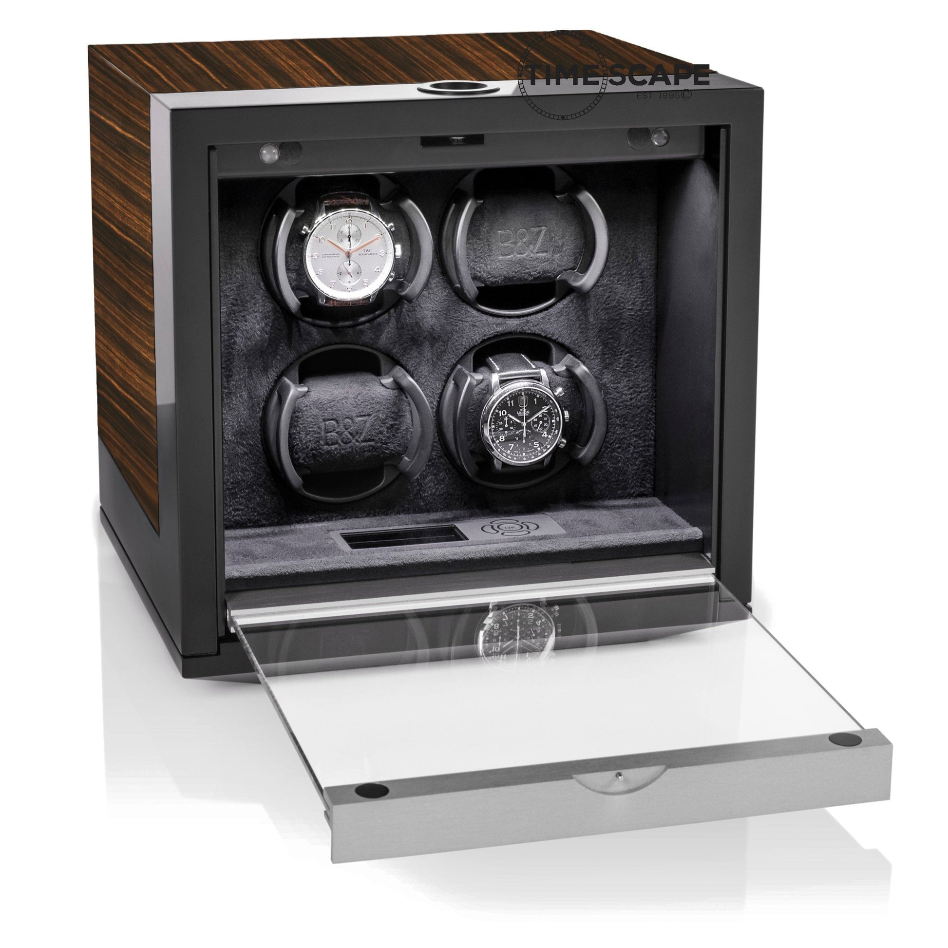 The TIME MOVER® - NEO Models are the latest technological designs of modern, sleek German craftsmanship from the house of BUBEN & ZÖRWEG. The exterior case has macassar wood inlay and finished with a piano black high-gloss lacquered frame, the NEO 4 accommodates and winds four of your automatic timepieces. A soft close lockable door with crystal glass pane and interior lit LED fade function lighting will accentuates and impressively display your collection while the finest plush velour protects your timepieces within. Using innovative technology, a push button LCD panel will program your watch winder with three winding cycles, a sleep phase mode, fast wind option and preferred rotational direction. Powered by batteries or use the optional power adapter provided. Add-on a presentation column or hi-fidelity base column  to make a striking impact in any room décor interior.