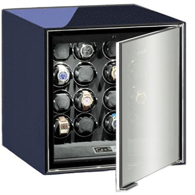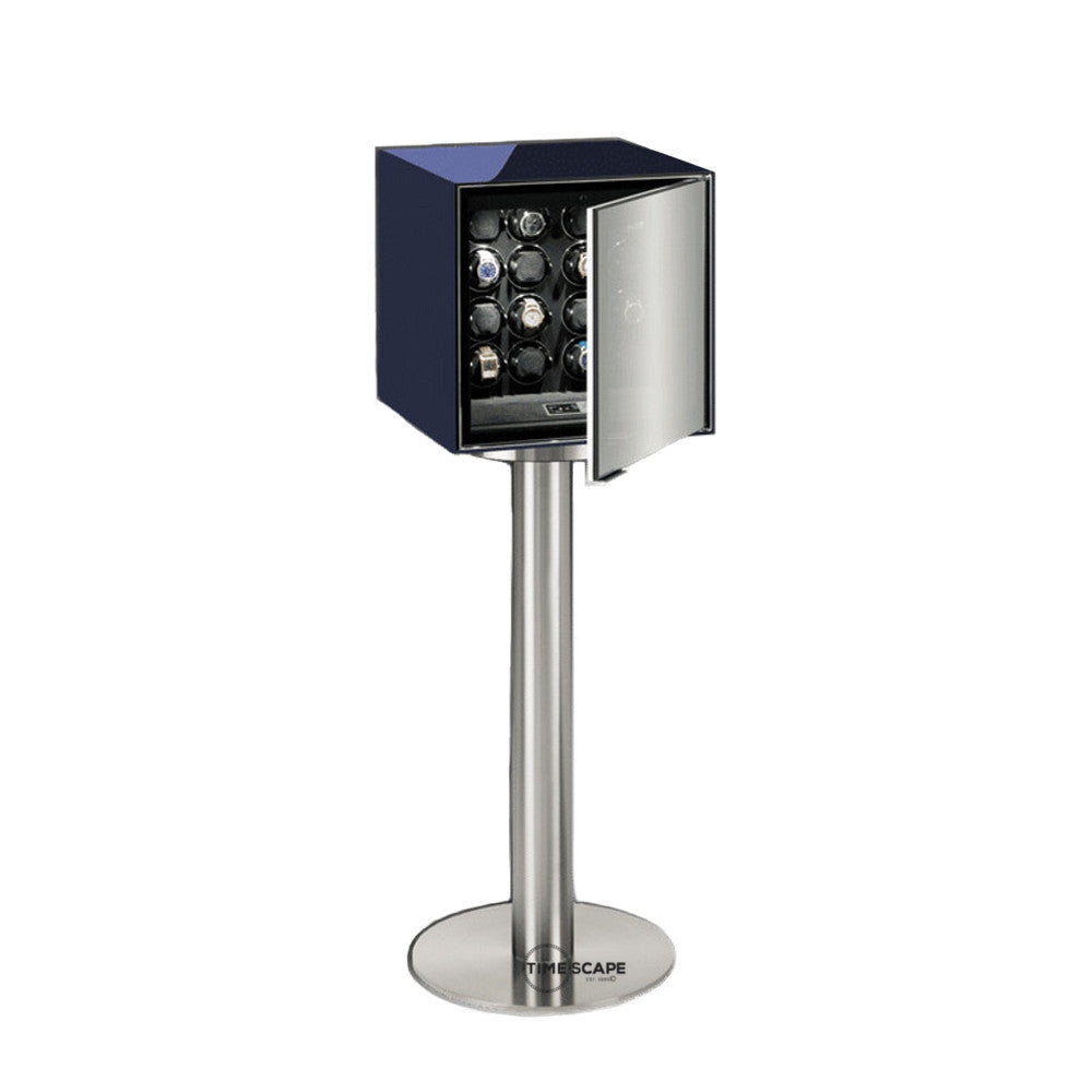 Another superb German crafted TIME MOVER® from the House of BUBEN & ZÖRWEG, the Quantum, is a prestigious watch winding unit for 16 watches. The cabinet is housed in an exotic glossy colored lacquered wood exterior with polished chrome hardware and an interior of the finest plush velour. Equipped with a state of the art LED lighting system that will beautifully illuminate your collection with a fade out function for an impressive effect. The Quantum 16 will secures your watch collection behind a lockable tinted two-way mirrored spy glass security door with specialty made Swiss electronic security locking system.  Additional add-on features available includes an aluminum base column, alarm system and/or GPS tracking system