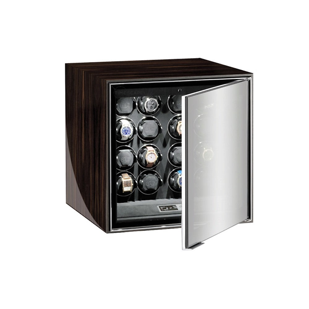 Another superb German crafted TIME MOVER® from the House of BUBEN & ZÖRWEG, the Quantum, is a prestigious watch winding unit for 16 watches. The cabinet is housed in an exotic lacquered macassar wood exterior with polished chrome hardware and an interior of the finest plush velour. Equipped with a state of the art LED lighting system that will beautifully illuminate your collection with a fade out function for an impressive effect. The Quantum 16 will secures your watch collection behind a lockable tinted two-way mirrored spy glass security door with specialty made Swiss electronic security locking system.  Additional add-on features available includes an aluminum base column, alarm system and/or GPS tracking system