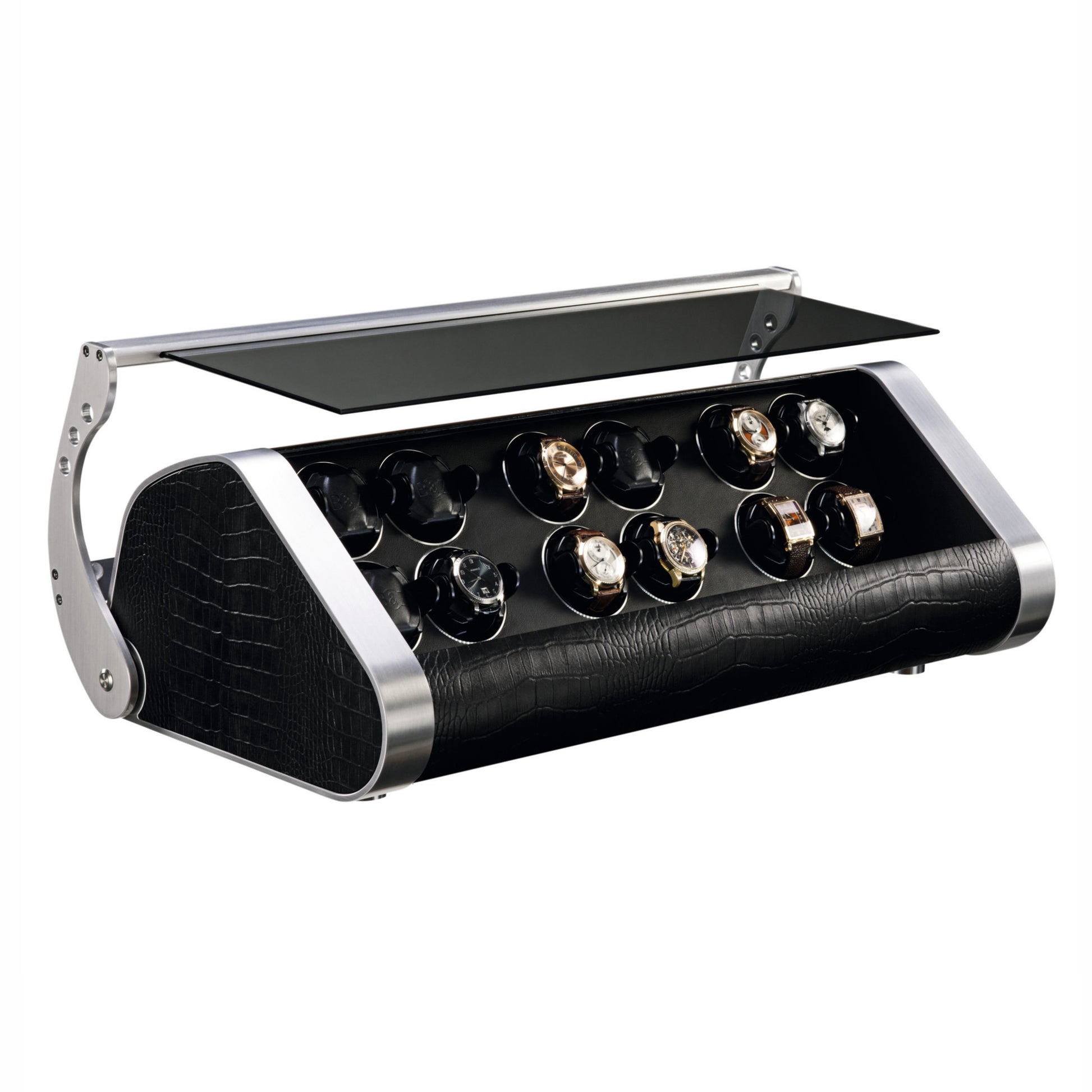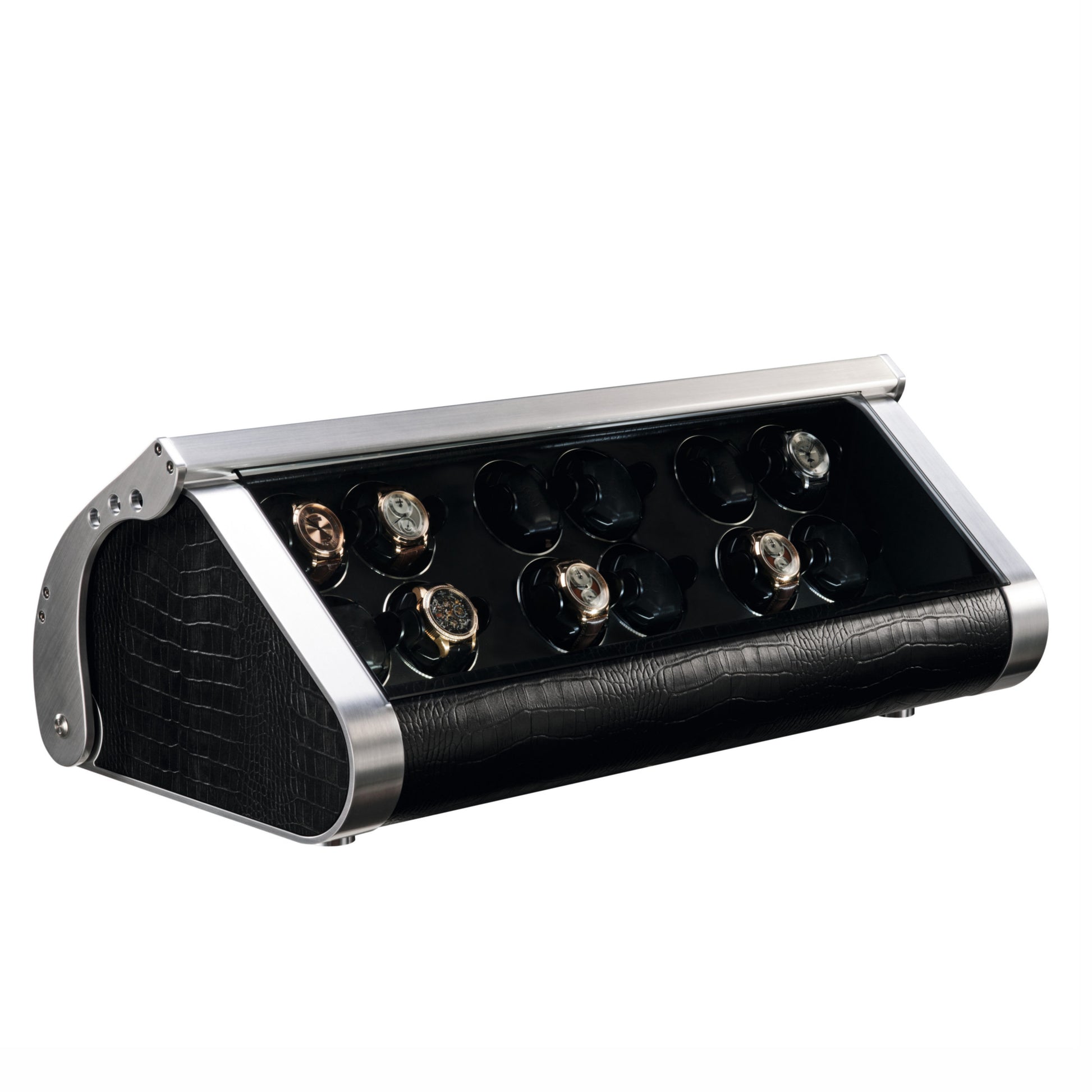 The REVOLUTION Collection from the House of BUBEN & ZORWEG is an 8-unit watch winding system made of superior German craftmanship. The REVOLUTION 12 is composed of an aluminum frame with an exterior of crocodile grained calf skin leathers. Your timepieces are on full display with state of the art LED lighting system with fade function, under a crystal glass hood secured with a German-made safety lock. Covered with the finest Italian Nappa leather interior, a push button LCD panel will program your watch winder with three winding cycles, a sleep phase mode, fast wind option and preferred rotational direction. Powered by a power adapter with an optional add-on presentation column or hi-fidelity base column to make a striking impact in any room interior décor .