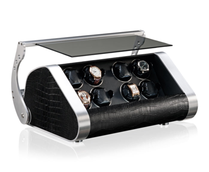The REVOLUTION Collection is an 8-unit watch winding system made of superior German craftmanship from the House of BUBEN & ZORWEG.  Composed of an aluminum curved frame, the REVOLUTION 8 has an exterior of crocodile grained calf-skin leathers. Your timepieces are on full display under a crystal glass hood with an innovative state-of-the art soft-close German-made locking mechanism. Covered with the finest Italian Nappa leather interior, a push button LCD panel will program your watch winder with three winding cycles, a sleep phase mode, fast wind option and preferred rotational direction. Powered by a power adapter with an optional add-on presentation column or hi-fidelity base column to make a striking impact in any room interior décor.