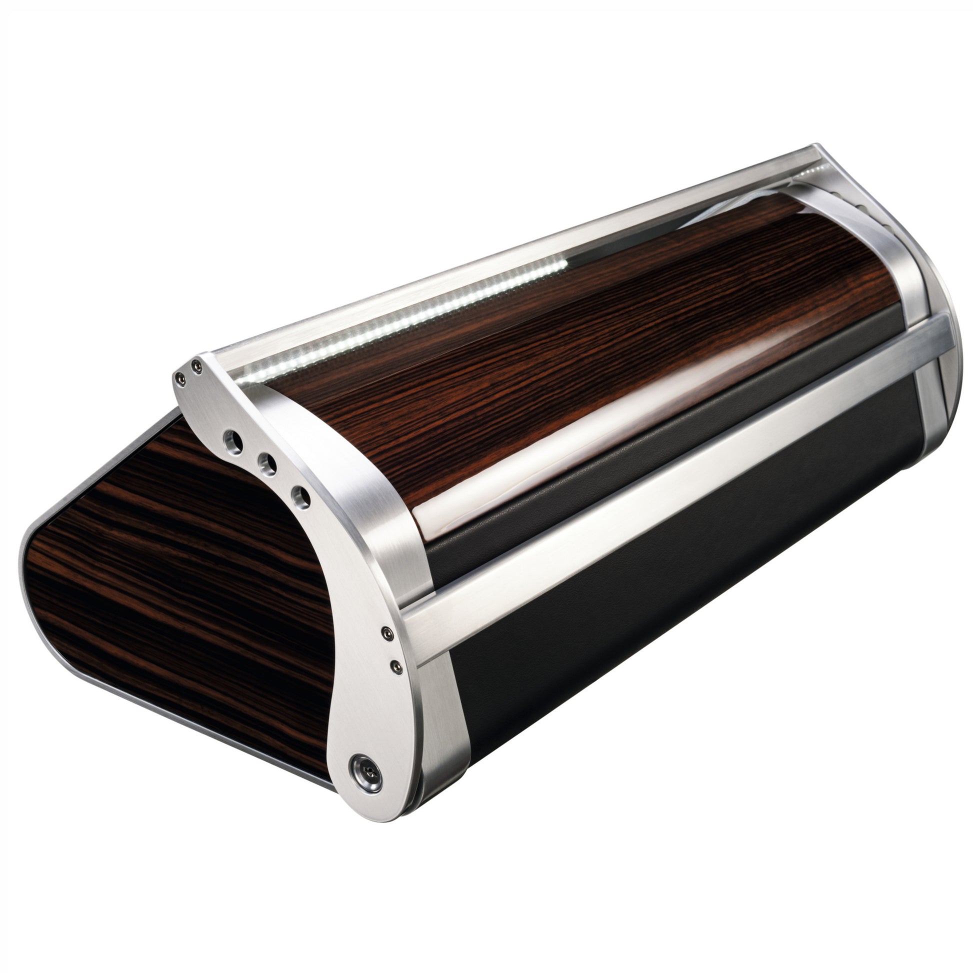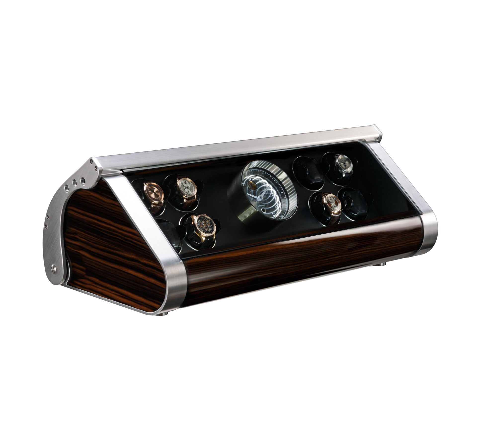 The REVOLUTION Collection featuring a BUBEN & ZÖRWEG clock, is an 8-unit watch winding system made with superior German craftmanship.  Composed of an aluminum frame with an exterior of exotic glossy macassar woods, the REVOLUTION V8 comes equipped with lockable soft-close crystal glass hood. Integrated into the center console is a signature BUBEN & ZÖRWEG clock set within an interior lined in finest Italian Nappa leathers.  A push button LCD panel will program your watch winder with three winding cycles, a sleep phase mode, fast wind option and preferred rotational direction. Powered by a power adapter with an optional add-on presentation column or hi-fidelity base column to make a striking impact in any room décor interior.