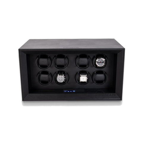 The TIME MOVER® SAFE MASTER Collection is an exquisite watch winding system manufactured with superior German craftsmanship from the house of BUBEN & ZÖRWEG. Designed to integrate into cabinets or be placed into your security safe, the SAFE MASTER 8 watch winder will accommodate and wind eight of your most prestigious timepieces. The open face frame design is completely upholstered with the finest pebble grained leather exterior.  Using innovative technology with a programmable winding system, the SAFE MASTER has multi-directional rotations, sleep phase and fast wind mode that is powered by batteries or power adapter for table top use.