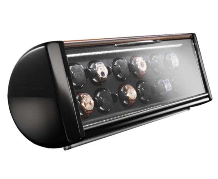 The SPIRIT Collection is another TIME MOVER® watch winding masterpiece with superior German craftsmanship from the House of BUBEN & ZÖRWEG. With a modern design combined with timelessness to create a lasting aesthetic appeal, the SPIRIT 12 will accommodate and wind twelve of your fine timepieces. The streamlined frame is composed of aluminum, exotic macassar wood inlay and finished with high-gloss piano black lacquer. A soft close lockable door with crystal glass pane and interior lit LED fade function lighting will accentuates and impressively display your collection while the finest plush velour protects your timepieces within. Using innovative technology, a push button LCD panel will program your watch winder with three winding cycles, a sleep phase mode, fast wind option and preferred rotational direction. Powered by batteries or use the optional power adapter provided. A presentation column or hi-fidelity base column is available for additional purchase to make a striking impact in any room décor interior.
