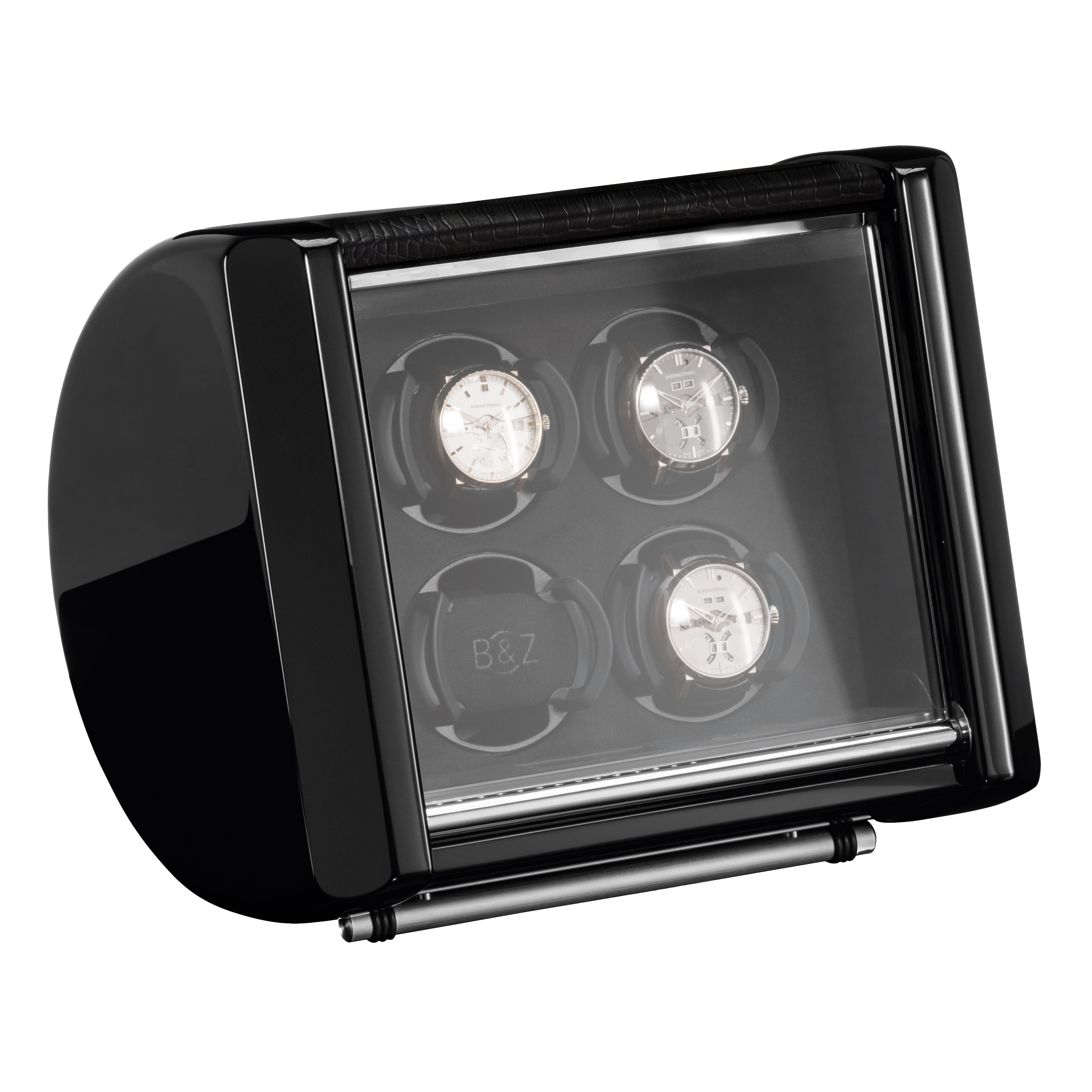 The SPIRIT Series is an exceptional TIME MOVER® watch winding masterpiece with modern aesthetics and timeless appeal from the House of BUBEN & ZÖRWEG. With superior German craftsmanship, the streamlined aluminum frame is accented with crocodile grained leather inlay and finished with high gloss piano black lacquer. The SPIRIT 4 will secure and wind four of your fine timepieces under a soft close lockable crystal glass hood. The interior is lined in a plush velour with LED lighting with fade function to accentuates and impressively showcase your collection. Using innovative technology, a push button LCD panel will program your watch winder with three winding cycles; a sleep phase mode, fast wind option and preferred rotational direction. Powered by batteries or use the optional power adapter provided. Add-on a presentation column or hi-fidelity base column to make a striking impact in any room décor interior.