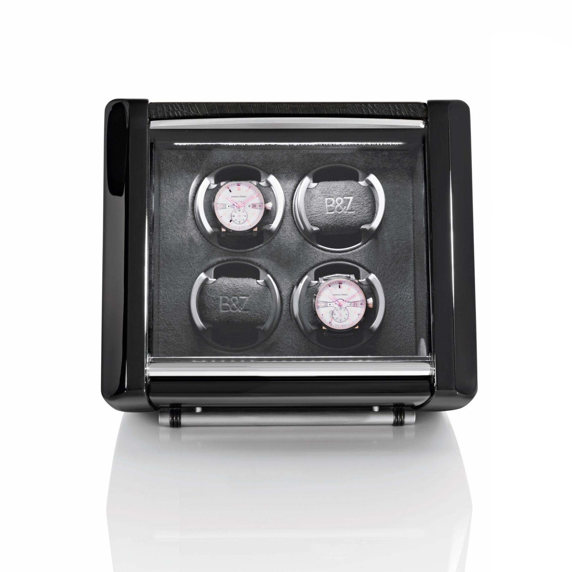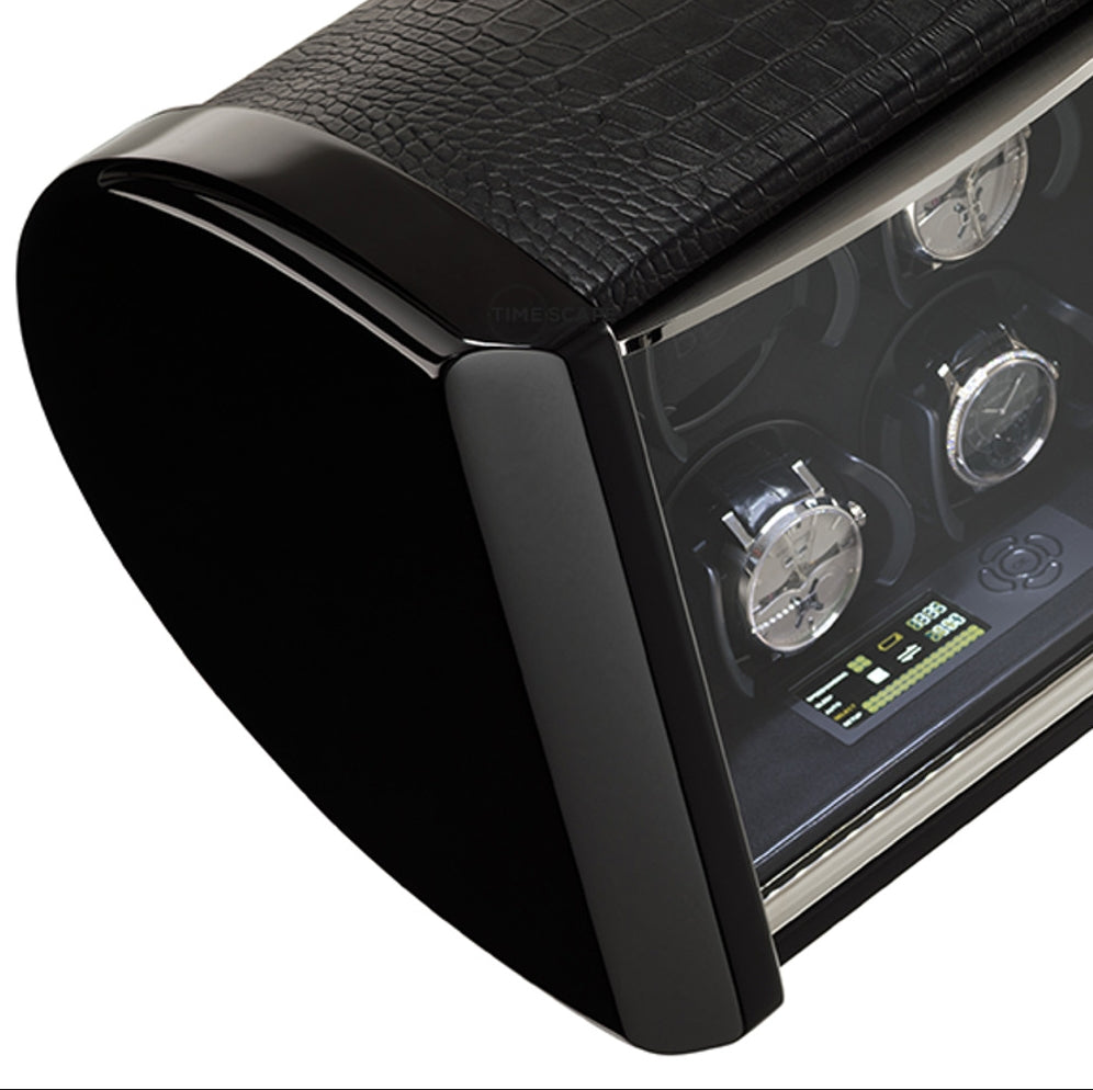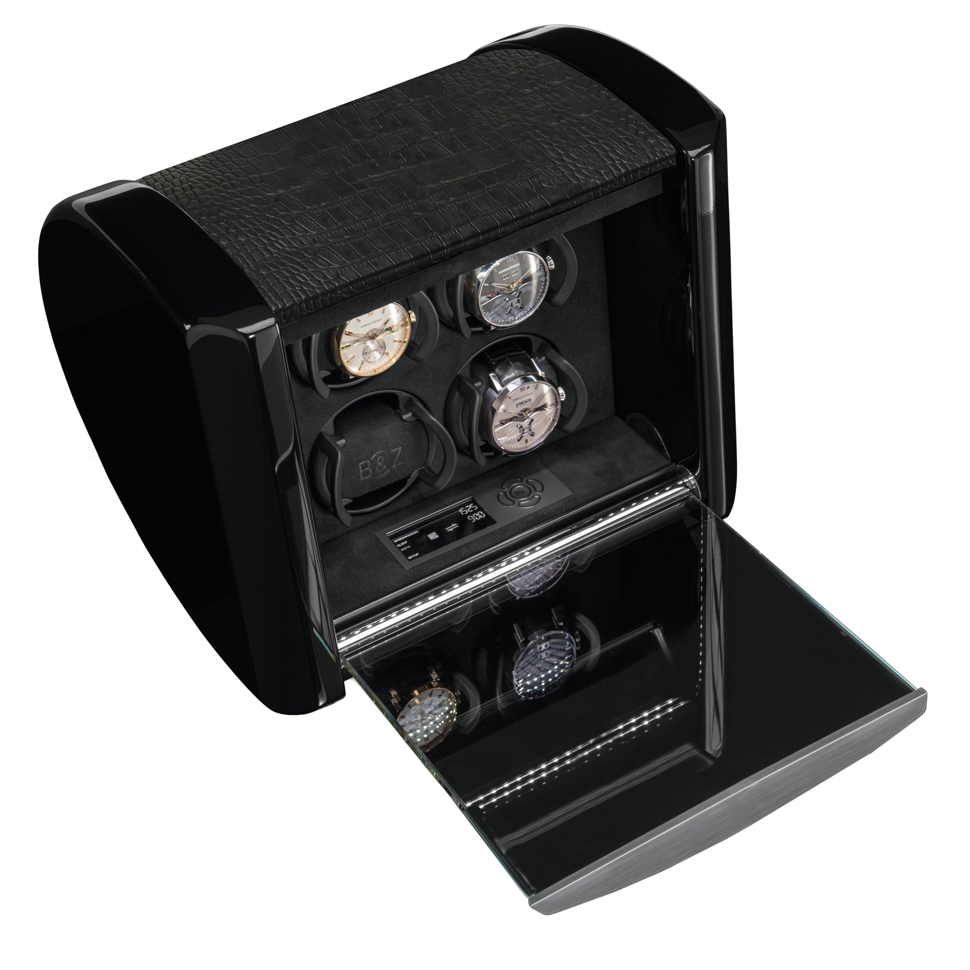 The SPIRIT Series is an exceptional TIME MOVER® watch winding masterpiece with modern aesthetics and timeless appeal from the House of BUBEN & ZÖRWEG. With superior German craftsmanship, the streamlined aluminum frame is accented with crocodile grained leather inlay and finished with high gloss piano black lacquer. The SPIRIT 4 will secure and wind four of your fine timepieces under a soft close lockable crystal glass hood. The interior is lined in a plush velour with LED lighting with fade function to accentuates and impressively showcase your collection. Using innovative technology, a push button LCD panel will program your watch winder with three winding cycles; a sleep phase mode, fast wind option and preferred rotational direction. Powered by batteries or use the optional power adapter provided. Add-on a presentation column or hi-fidelity base column to make a striking impact in any room décor interior.