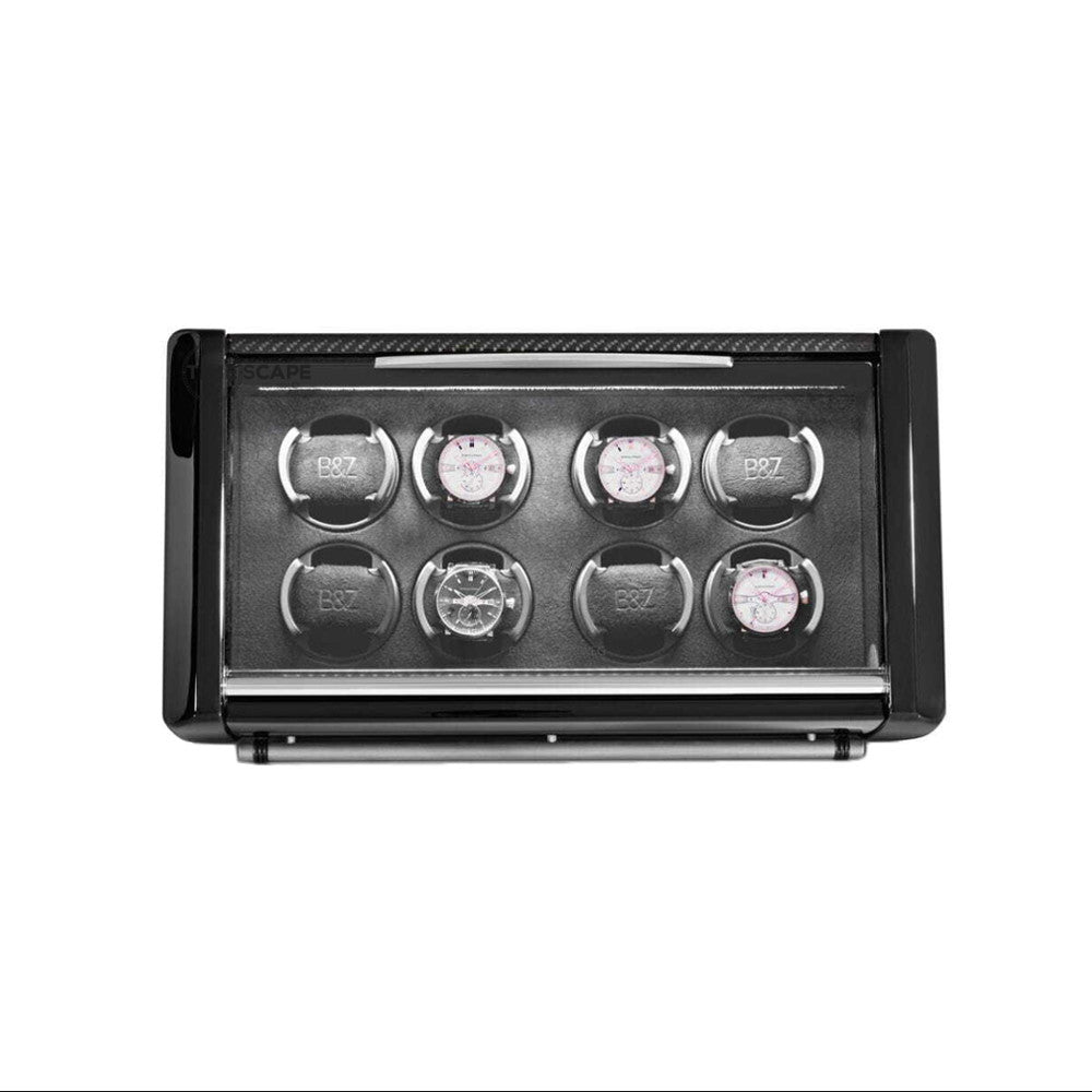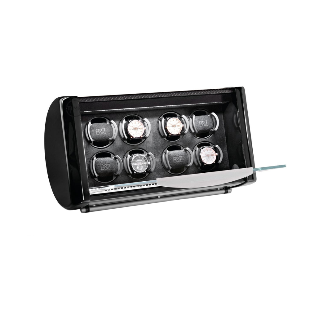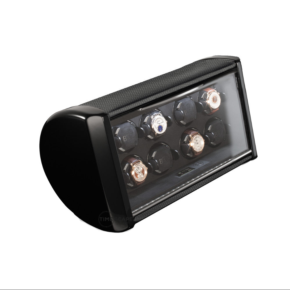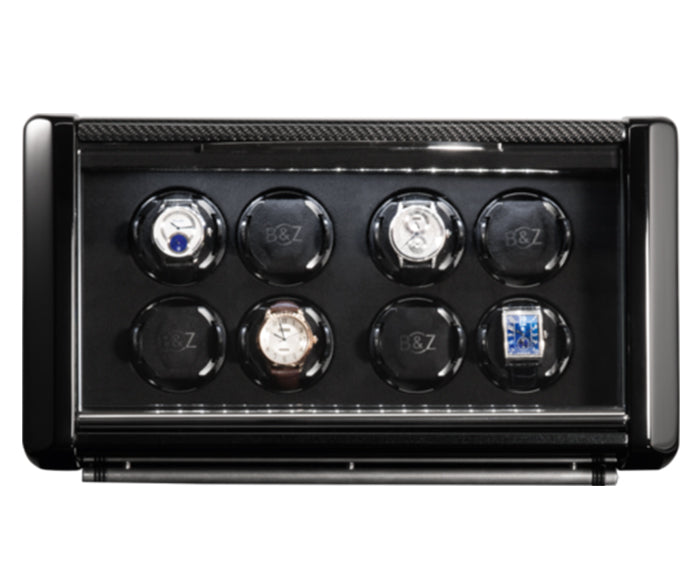 The SPIRIT Series is an exceptional TIME MOVER® watch winding masterpiece with modern aesthetics and timeless appeal from the House of BUBEN & ZÖRWEG. With superior German craftsmanship, the streamlined aluminum frame is covered with sleek glossy carbon fiber and finished with high gloss piano black lacquer. The SPIRIT 12 will secure and wind twelve of your fine timepieces under a soft close lockable crystal glass hood. The interior is lined in a plush velour with LED lighting with fade function to accentuates and impressively showcase your collection. Using innovative technology, a push button LCD panel will program your watch winder with three winding cycles; a sleep phase mode, fast wind option and preferred rotational direction. Powered by batteries or use the optional power adapter provided. Add-on a presentation column or hi-fidelity base column to make a striking impact in any room décor interior.