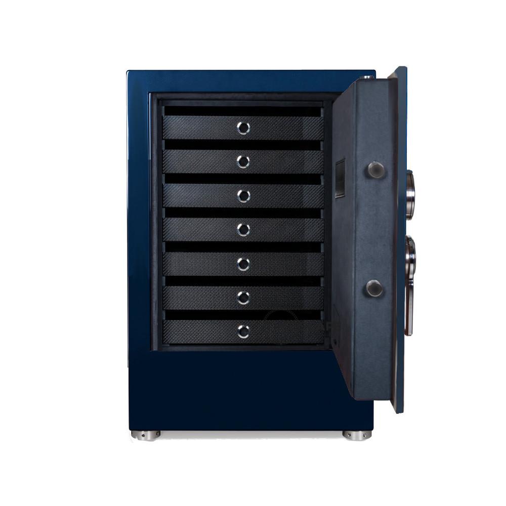 The SI-60 German certified VdS 2450/EN1143-1 security safe with redundant 7-digit keypad locking system with emergency key will keep items secure. Fitted with height adjusting stainless feet for your convenience. This piece can be customized to your specification of storage drawer components, TIME MOVER® winding units, lacquered colors, two-tone options, metal colors and carbon fiber accents. You can upgrade the German security certification VdSI to a VdSIII penetration classification for an additional fee.