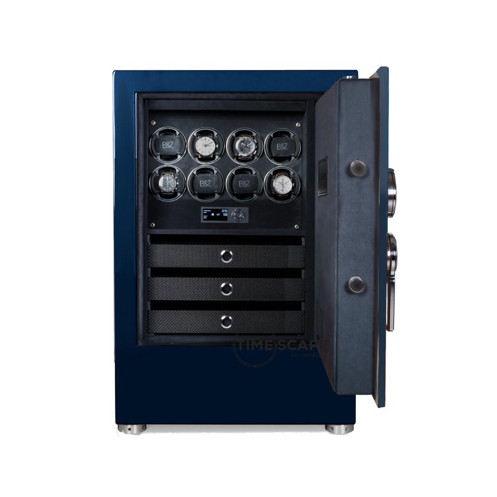 The TURBO Collection is the latest in security for your timepieces, from the House of BUBEN & ZÖRWEG, masters of fine German craftsmanship for the most elite prestigious watch collectors. Inspired by the world of luxury race cars with sleek style and high-tech materials, the TURBO S is a compact, space saving watch winding and multi-storage system. With streamlined design in a monocoque steel frame, finished with metallic lacquer in a variety of vibrant colors gives lasting security and appeal. Featuring a steel door handle with integrated shiny carbon fiber and matching interior drawers with polished chrome accents. The interior is covered in luxurious plush velour with state-of-the-art fade function LED lighting system to beautifully illuminate your collection. Equipped with 8, or 16 TIME MOVER® winding units and 7(no winders) 3 or single storage drawer with your choice of inserts.