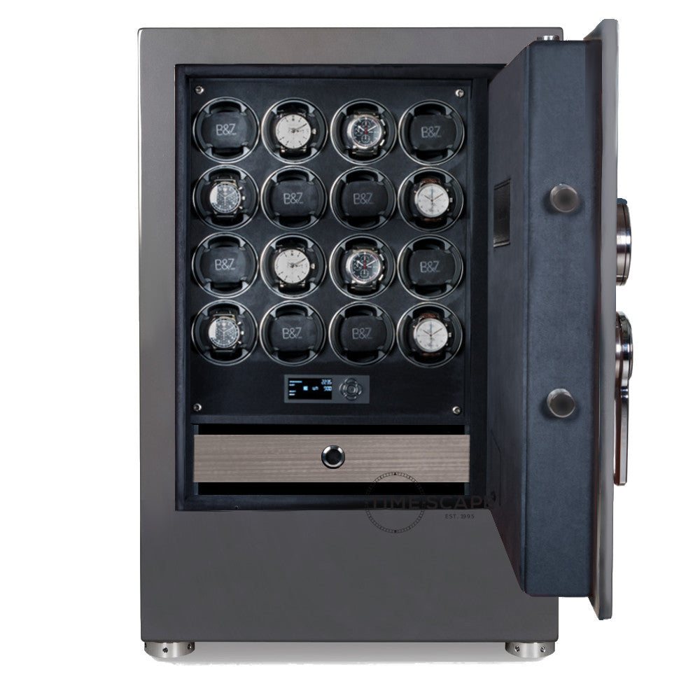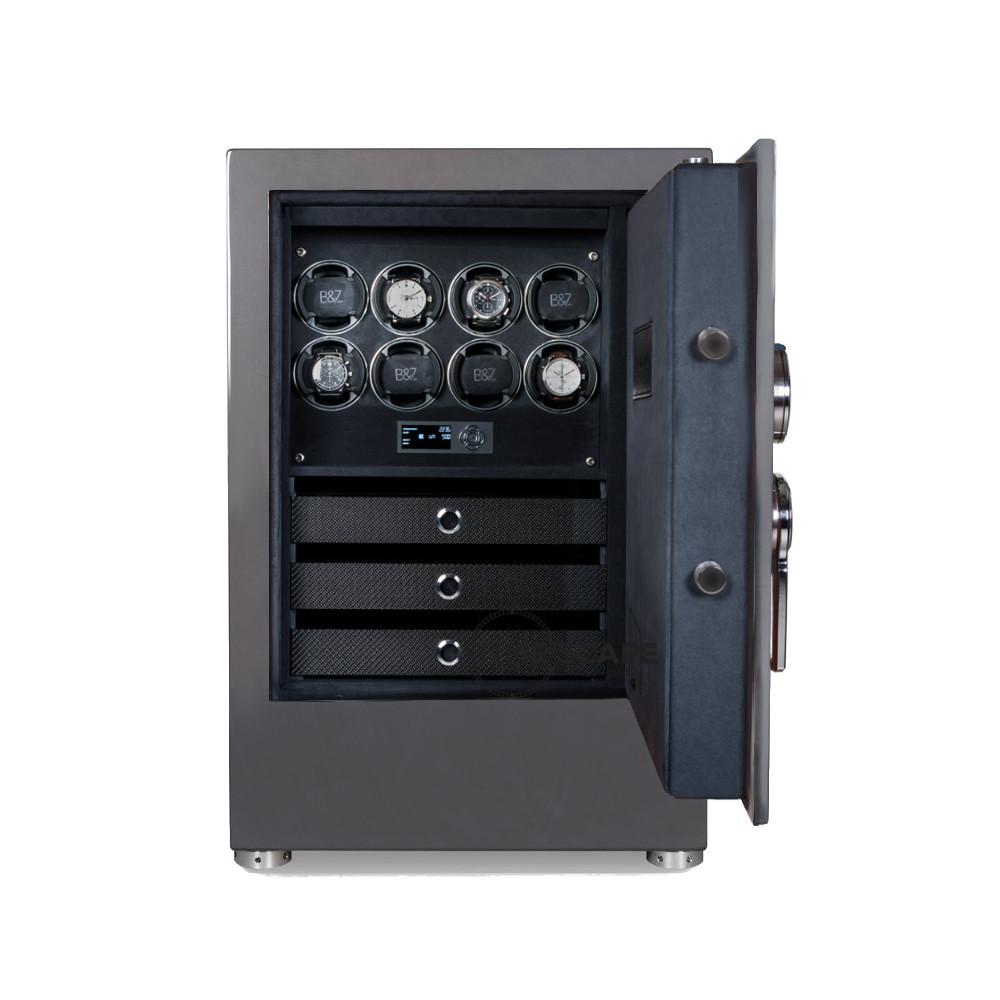 The TURBO Collection is the latest in security for your timepieces, from the House of BUBEN & ZÖRWEG, masters of fine German craftsmanship for the most elite prestigious watch collectors. Inspired by the world of luxury race cars with sleek style and high-tech materials, the TURBO S is a compact, space saving watch winding and multi-storage system. With streamlined design in a monocoque steel frame, finished with metallic lacquer in a variety of vibrant colors gives lasting security and appeal. Featuring a steel door handle in your choice of color and interior accents of glossy carbon fiber, macassar wood, matte eucalyptus or forged carbon finishes. The interior is covered in luxurious plush velour with your choice style of drawers inserts with polished chrome hardware. State-of-the-art fade function LED lighting system will beautifully illuminate your collection. Equipped with 8, or 16 TIME MOVER® winding units and 6(no winders) 3, 2(standard & oversize) or single storage drawer with and various storage spaces & drawer components according to which style you choose.