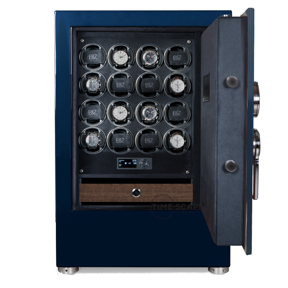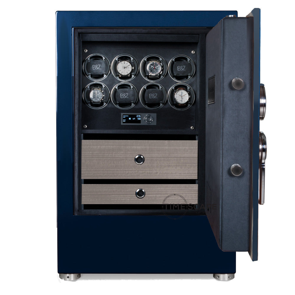 The TURBO Collection is the latest in security for your timepieces, from the House of BUBEN & ZÖRWEG, masters of fine German craftsmanship for the most elite prestigious watch collectors. Inspired by the world of luxury race cars with sleek style and high-tech materials, the TURBO S is a compact, space saving watch winding and multi-storage system with streamlined design in a monocoque steel frame. Finished with metallic lacquer in a variety of vibrant colors featuring a steel door integrated with shiny carbon fiber accents and polished chrome hardware in several color options. The interior is covered in luxurious plush velour with a variety of drawer insert options finished in your choice of glossy carbon fiber, macassar wood, matte eucalyptus or forged carbon accents. State-of-the-art fade function LED lighting system will beautifully illuminate your collection. Equipped with 8, or 16 TIME MOVER® winding units and 6(no winders) 3, 2(standard & oversize) or single storage drawer with and various storage spaces & drawer components according to which style you choose.