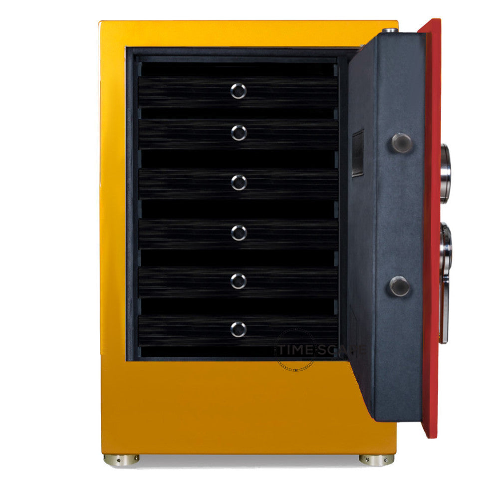 The SI-60 German certified VdS 2450/EN1143-1 security safe with redundant 7-digit keypad locking system with emergency key will keep items secure. Fitted with height adjusting stainless feet for your convenience. This piece can be customized to your specification of storage drawer components, TIME MOVER® winding units, lacquered colors, two-tone options, metal colors and carbon fiber accents. You can upgrade the German security certification VdSI to a VdSIII penetration classification for an additional fee.