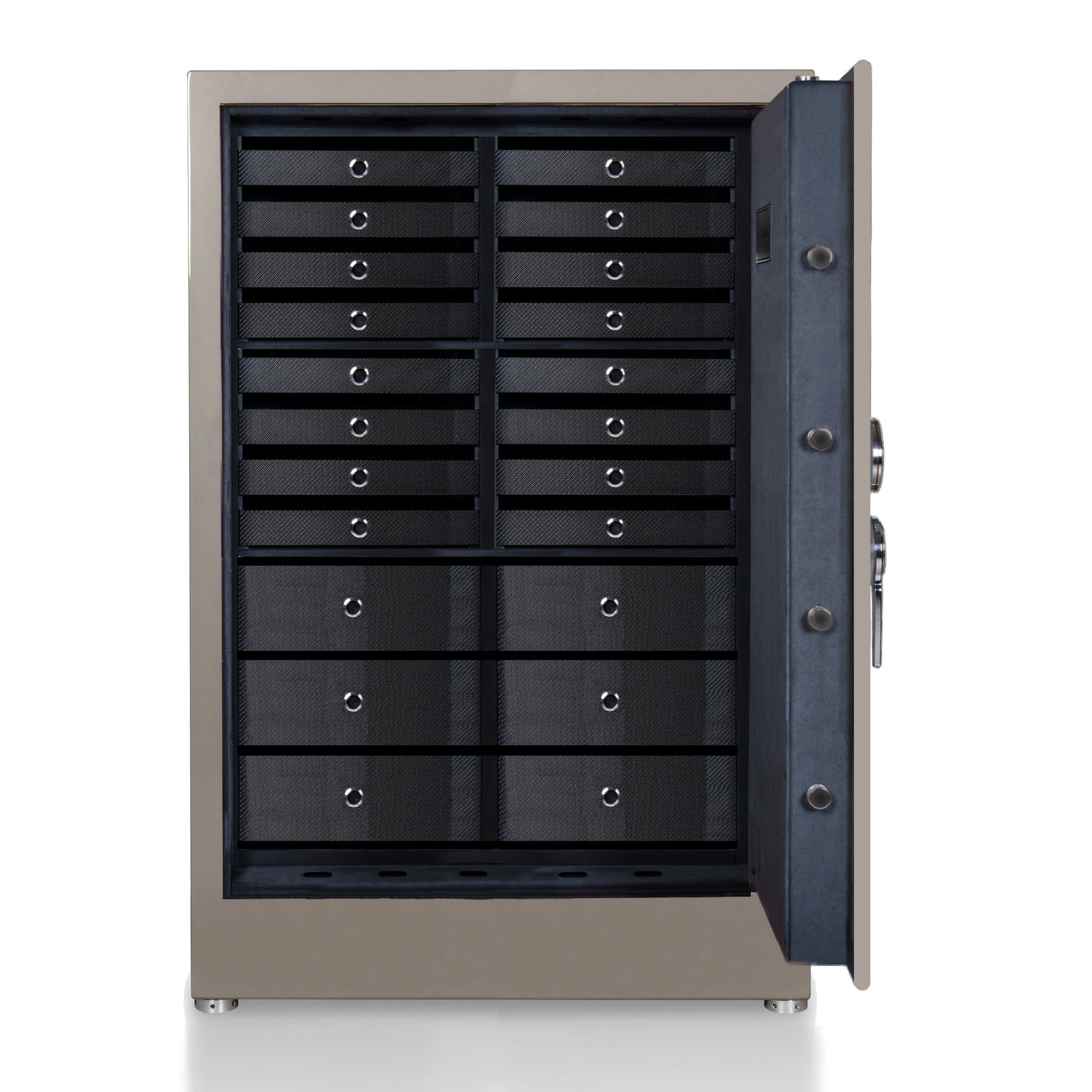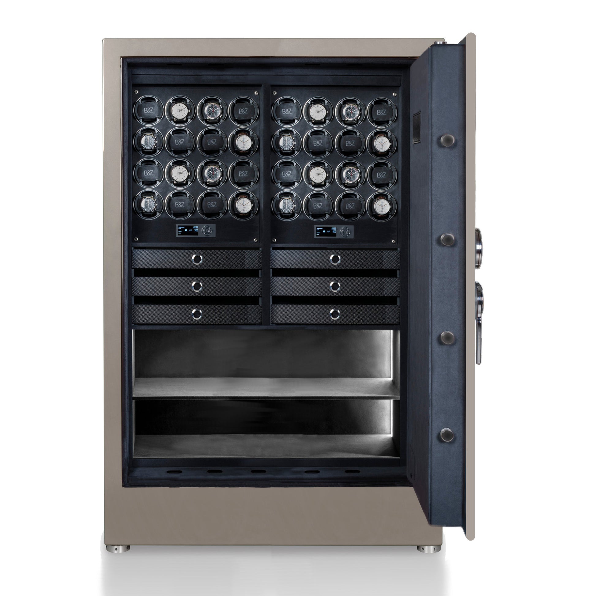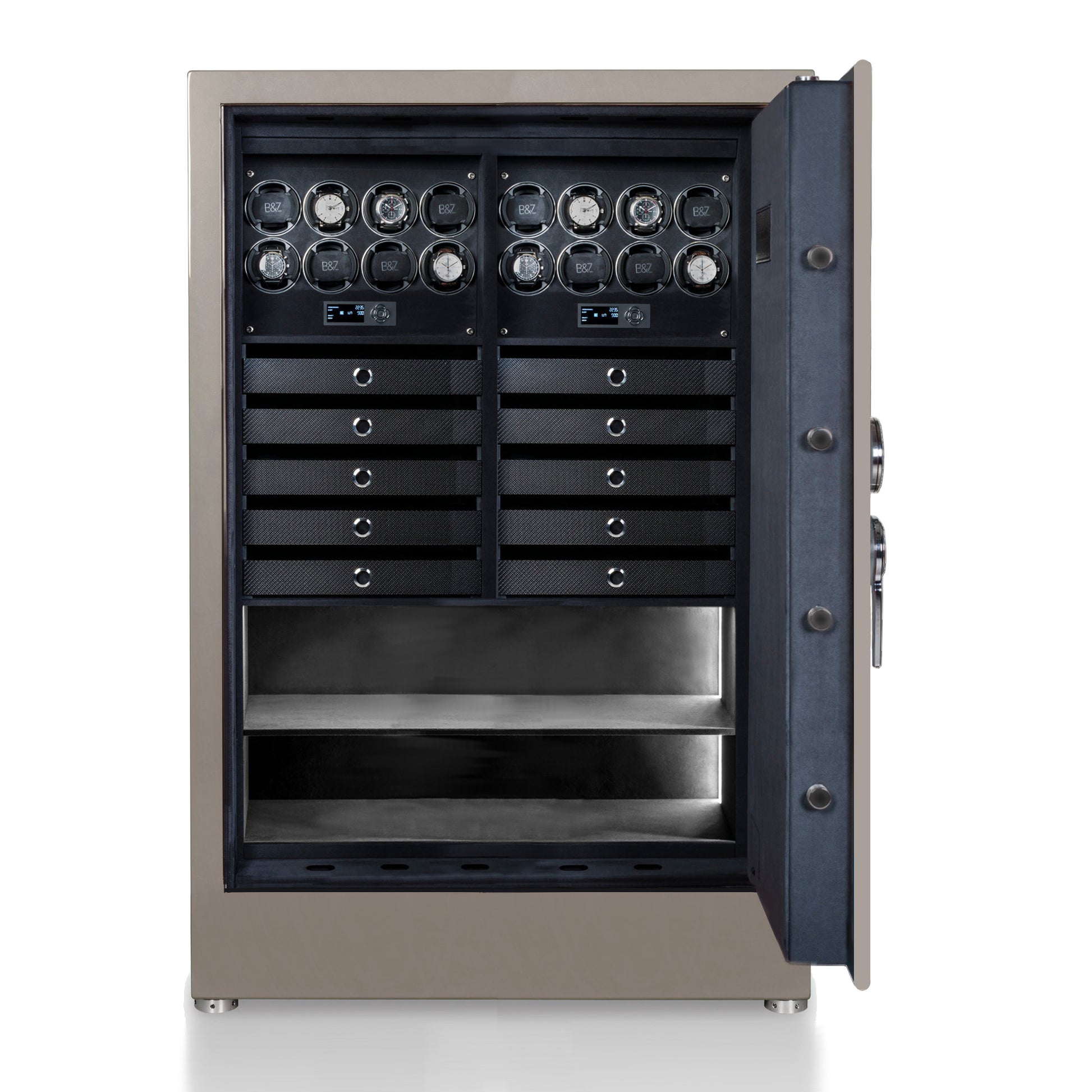 The SI-110 German certified VdS I security safe with redundant 7-digit keypad locking system with emergency key will keep items secure. Fitted with height adjusting stainless feet for your convenience. This piece can be customized to your specification of storage drawer components, TIME MOVER® winding units, lacquered colorstwo-tone options and metal colors, carbon fiber accents. You can upgrade the German security certification VdSI to a VdSIII penetration classification for an additional fee.
