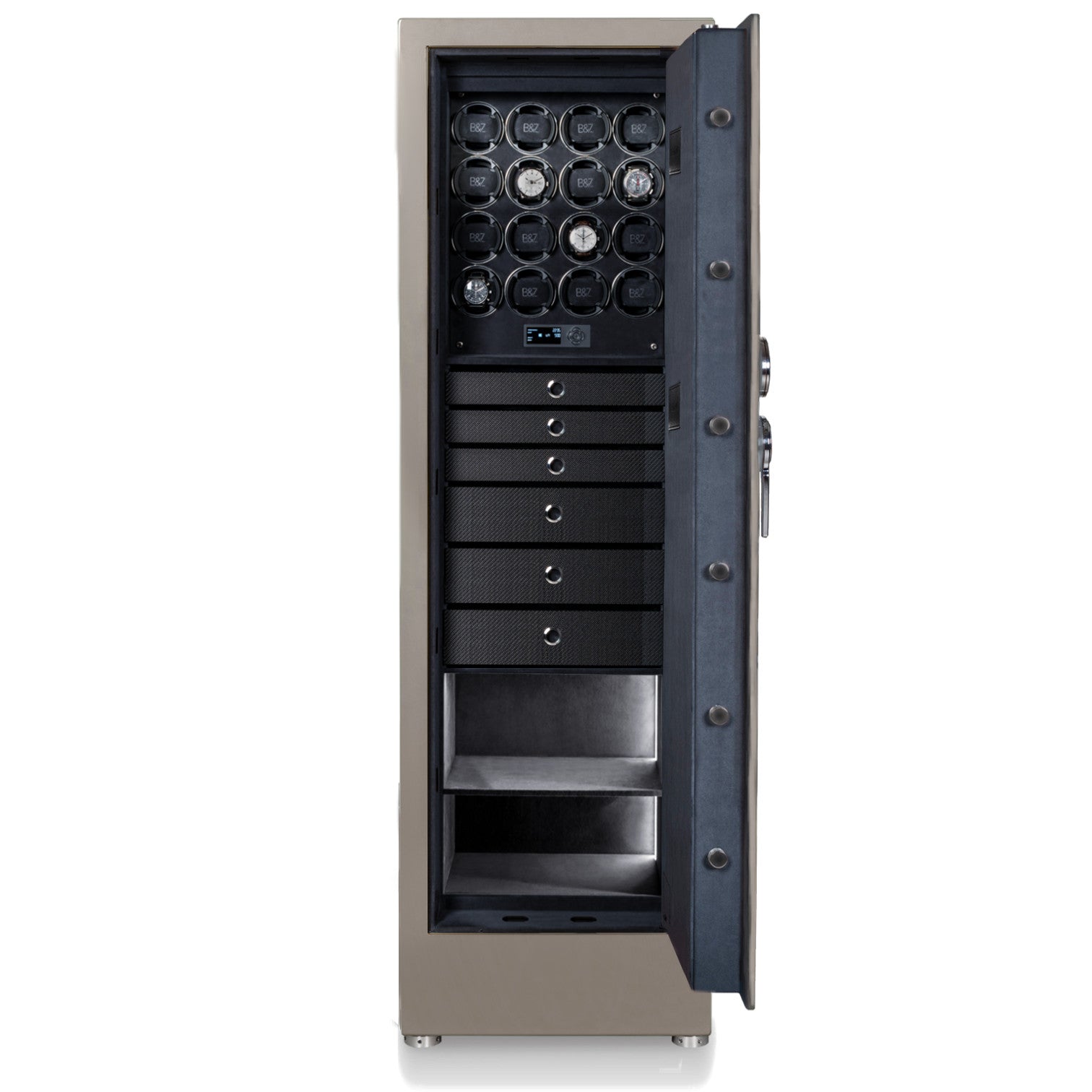 The SI-150 German certified VdS I security safe with redundant 7-digit keypad locking system with emergency key will keep items secure. Fitted with height adjusting stainless feet for your convenience. This piece can be customized to your specification of storage drawer components, TIME MOVER® winding units, lacquered colorstwo-tone options and metal colors, carbon fiber accents. You can upgrade the German security certification VdSI to a VdSIII penetration classification for an additional fee.