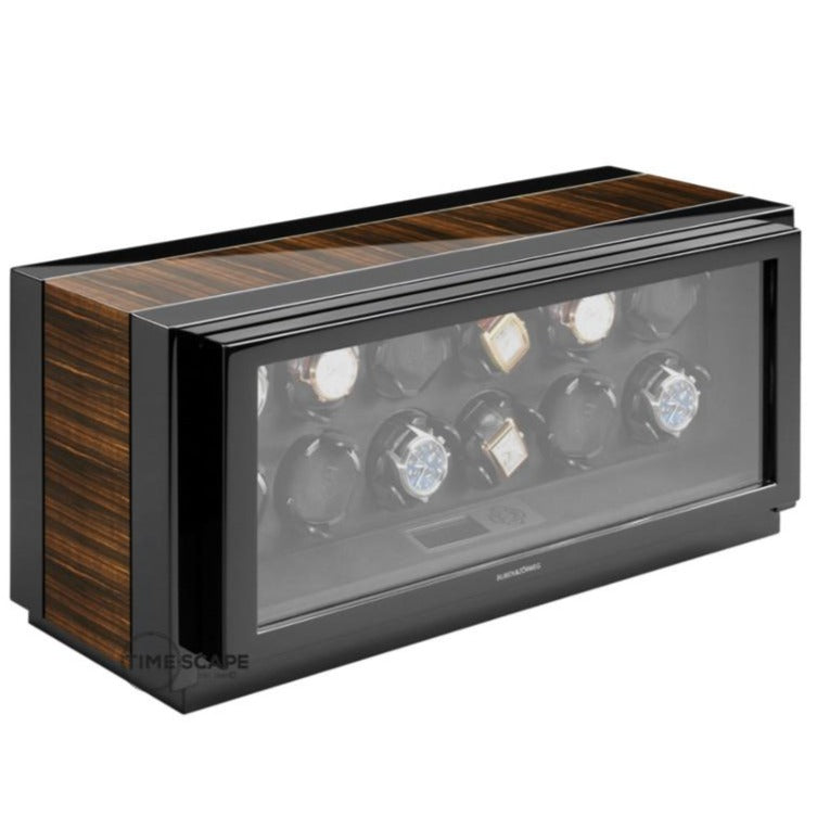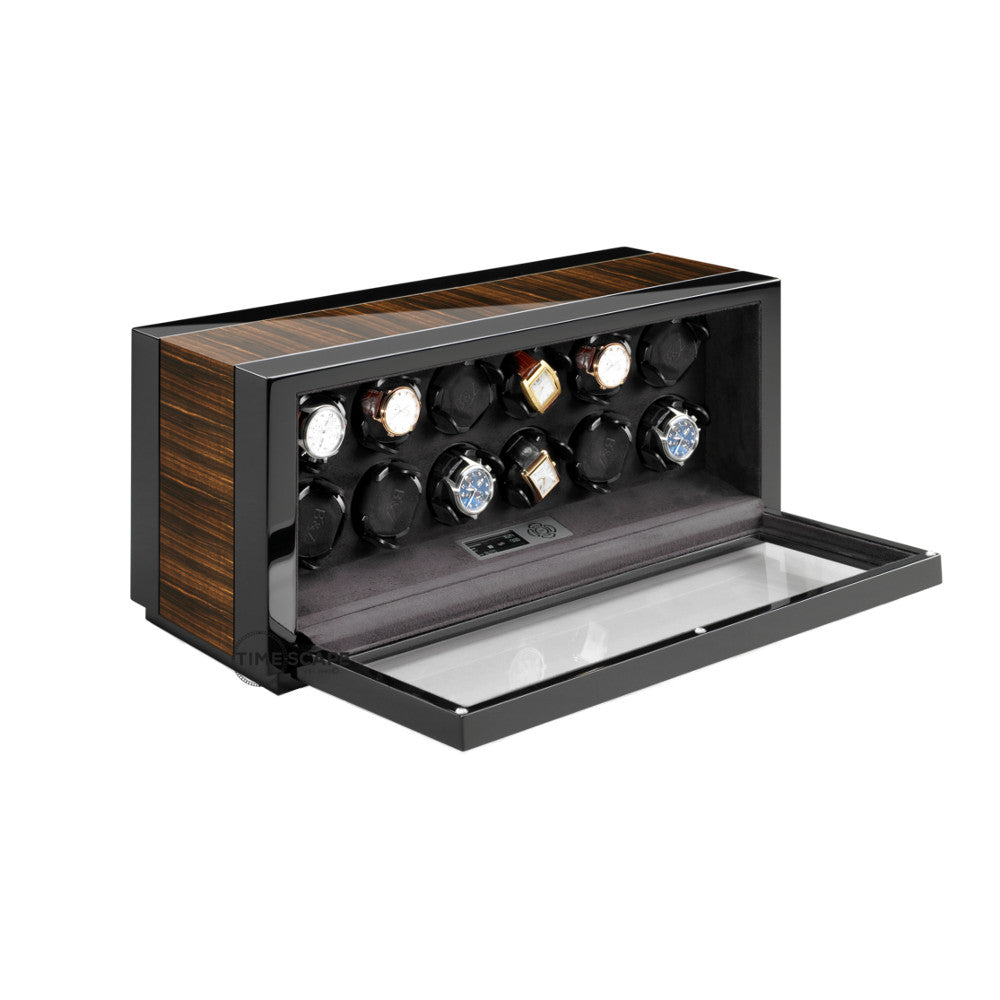 The TIME MOVER® VANTAGE Collection is an exquisite watch winding system manufactured with superior German craftsmanship form the house of BUBEN & ZÖRWEG. For those who appreciate clean functional designs, the VANTAGE 12 will accommodate and wind twelve of your fine timepieces within a sturdy wood frame constructed with macassar wood inlay and finished with piano black high-gloss lacquer. A soft close door with crystal glass pane will accentuates and impressively display your collection while the finest plush velour interior protects your timepieces. Using innovative technology, a push button LCD panel will program your watch winder with three winding cycles, a sleep phase mode, fast wind option and preferred rotational direction. Powered by batteries or use the optional power adapter provided. A presentation column or hi-fidelity base column is available for additional purchase to make a striking impact in any room décor interior.