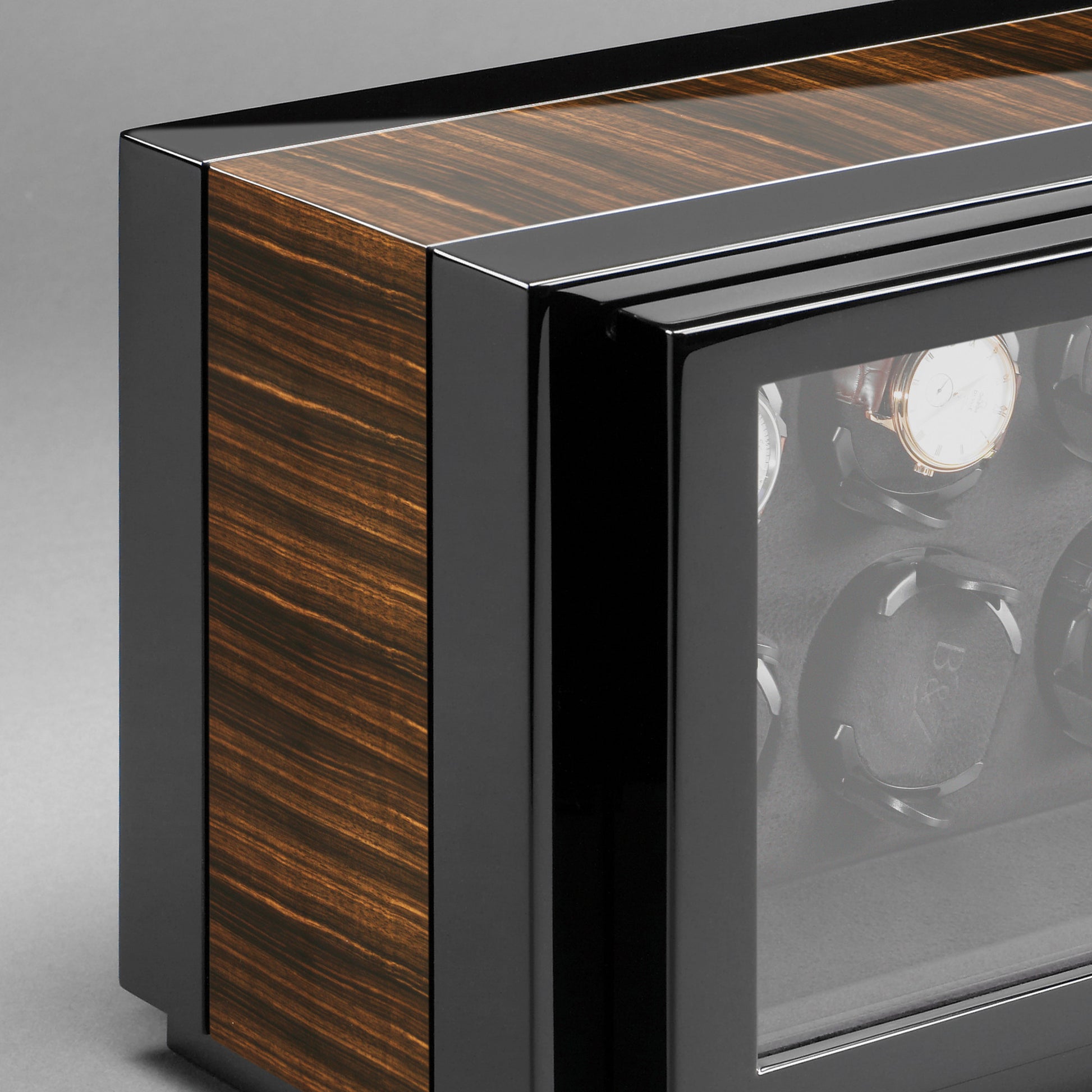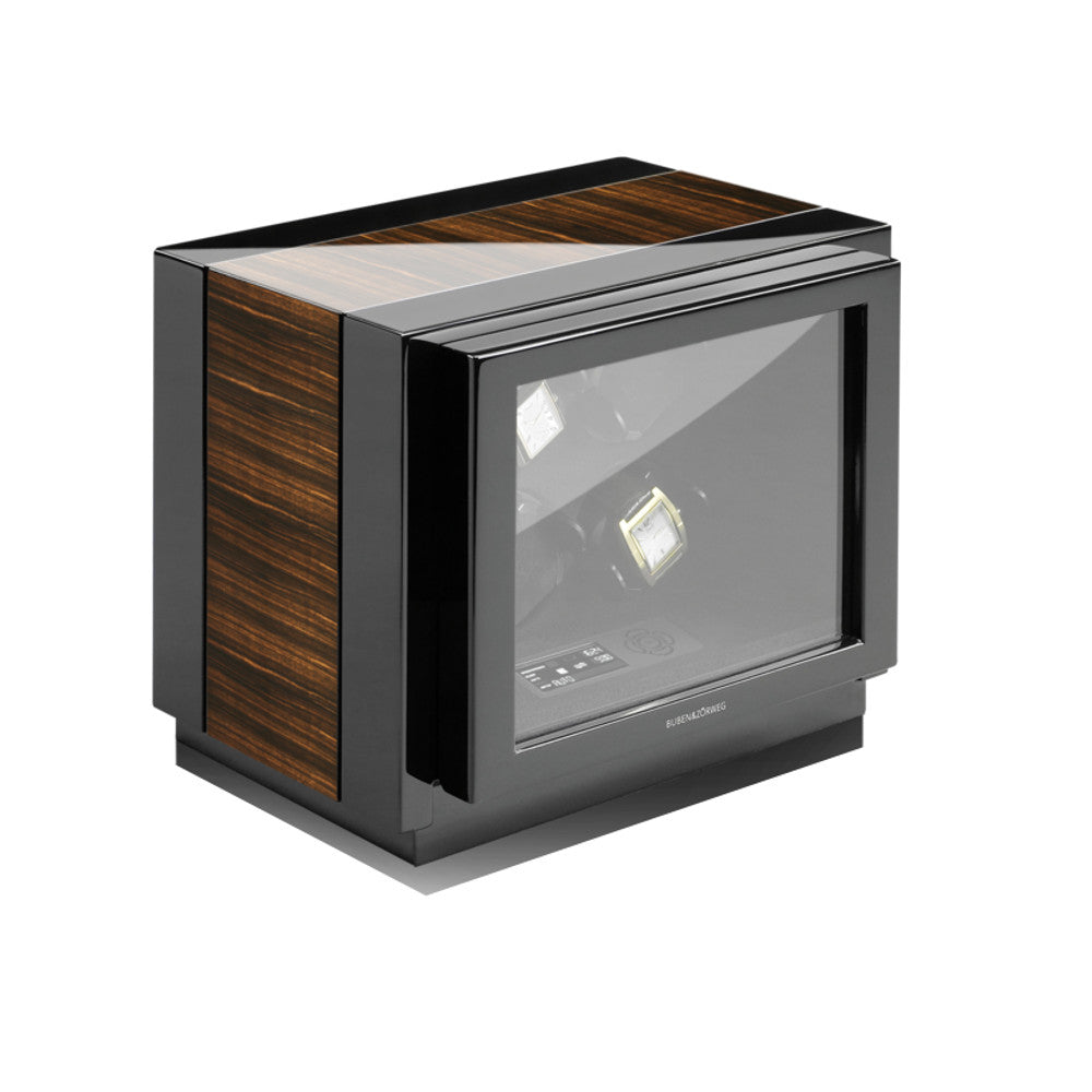 The TIME MOVER® - VANTAGE Collection is an exquisite watch winding system manufactured with superior German craftsmanship from the house of BUBEN & ZÖRWEG. For those who appreciate clean functional designs, the VANTAGE 4 will accommodate and wind four of your fine timepieces within a sturdy wood frame constructed with macassar wood inlay and finished with piano black high-gloss lacquer. A soft close door with crystal glass pane will accentuates and impressively display your collection while the finest plush velour interior protects your timepieces. Using innovative technology, a push button LCD panel will program your watch winder with three winding cycles, a sleep phase mode, fast wind option and preferred rotational direction. Powered by batteries or use the optional power adapter provided. Add-on a presentation column or hi-fidelity base column is available to make a striking impact in any room décor interior.