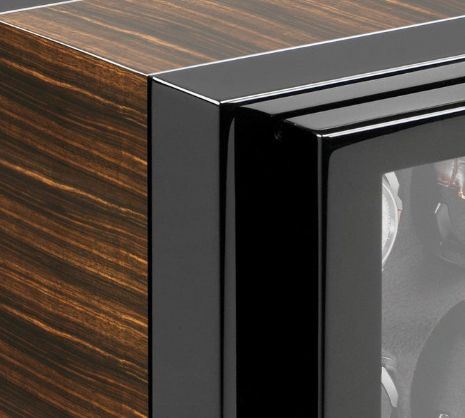 The TIME MOVER® VANTAGE Collection is an exquisite watch winding system manufactured with superior German craftsmanship from the house of BUBEN & ZÖRWEG. For those who appreciate clean functional designs, the VANTAGE 8 will accommodate and wind eight of your fine timepieces within a sturdy wood frame constructed with macassar wood inlay and finished with piano black high-gloss lacquer. A soft close door with crystal glass pane will accentuates and impressively display your collection while the finest plush velour interior protects your timepieces. Using innovative technology, a push button LCD panel will program your watch winder with three winding cycles, a sleep phase mode, fast wind option and preferred rotational direction. Powered by batteries or use the optional power adapter provided. A presentation column or hi-fidelity base column is available for additional purchase to make a striking impact in any room décor interior.