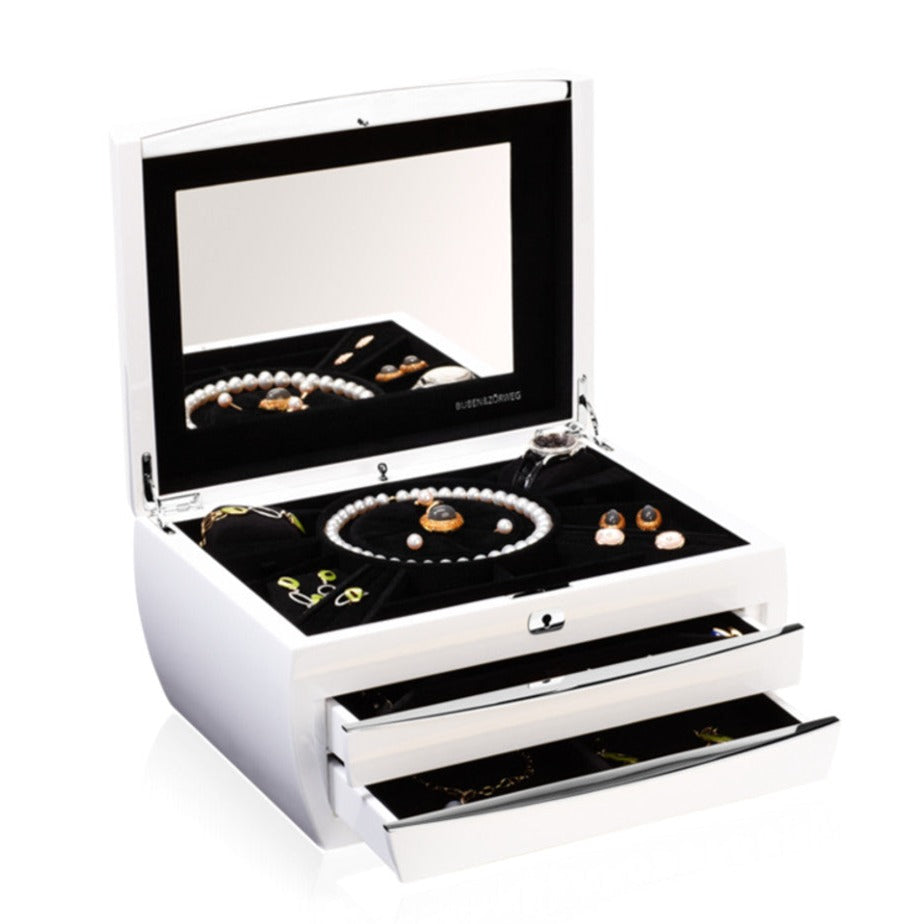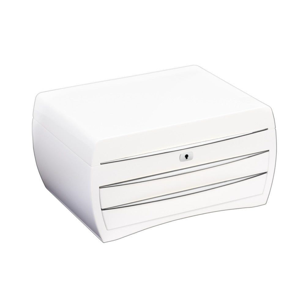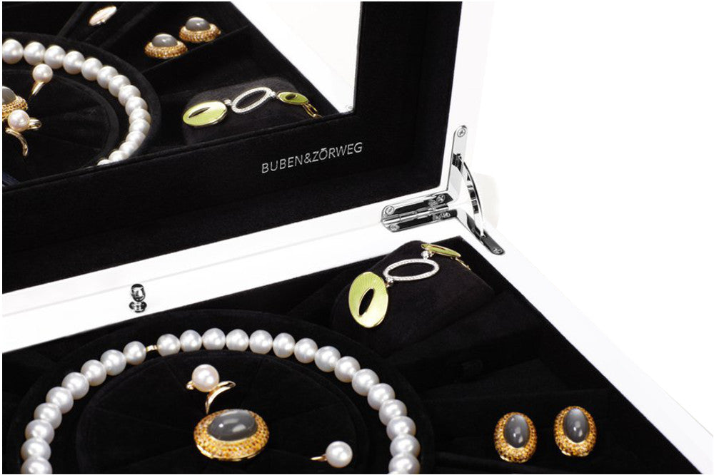 The Cosmopolitan  jewelry case by BUBEN&ZORWEG is hand finished, with master craftsmanship, perfection, and quality materials. This collection case houses 2 drawers for your jewelry with a cherry wood exterior covered in 10 layers of white high gloss lacquer. You can travel happy and be assured that your jewelry and gems are safe and sound with a hand polished gold plated handle and lock. A collector’s case from BUBEN&ZORWEG is the optimal solution for value enhancing storage and impressive presentation of your jewelry pieces.