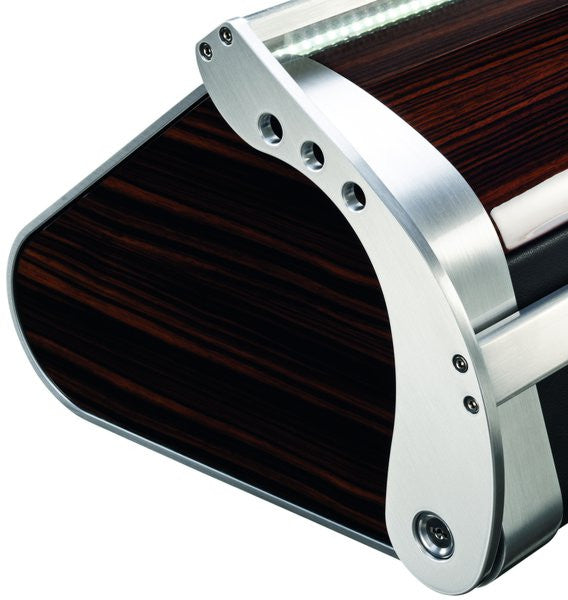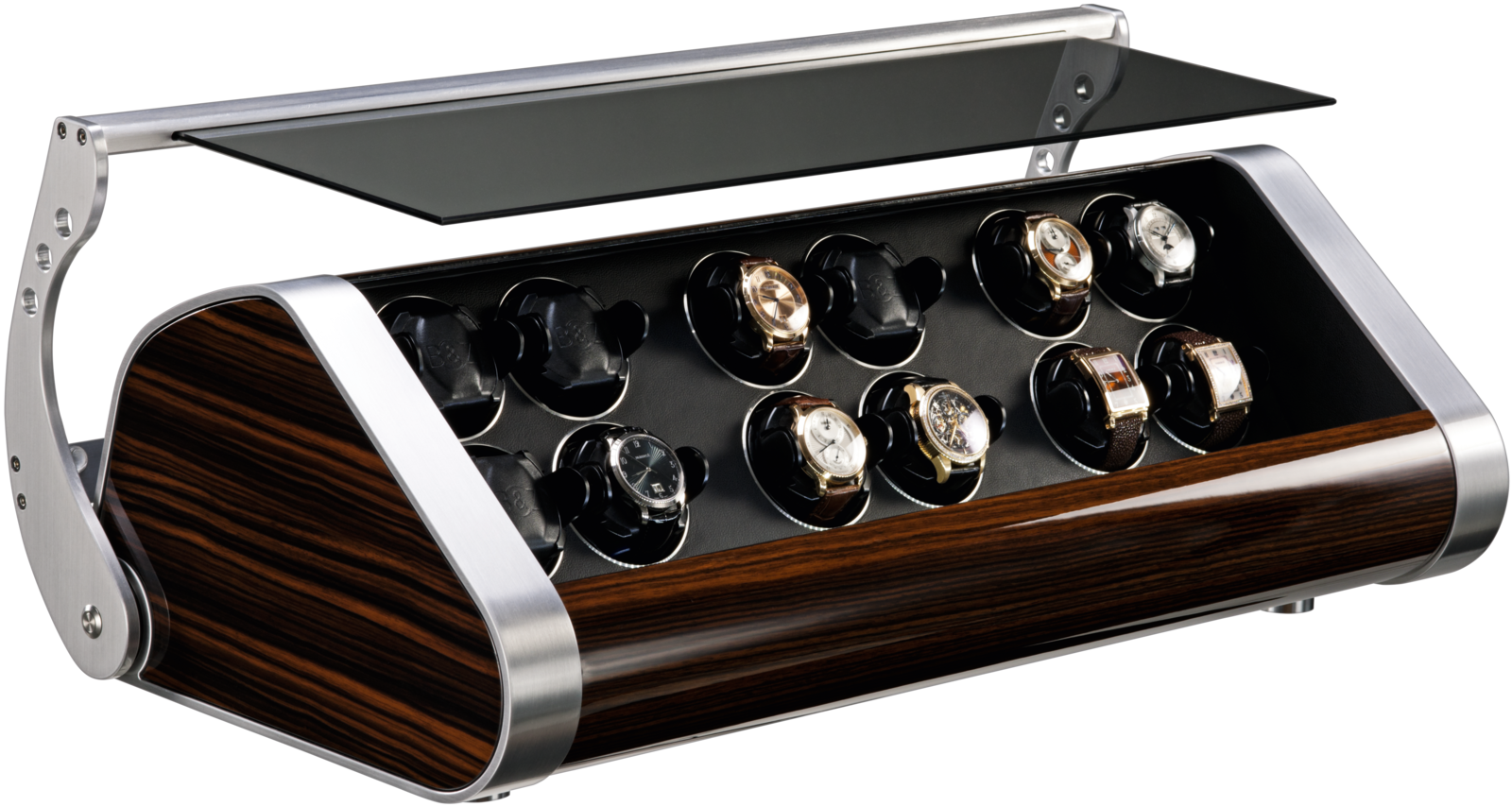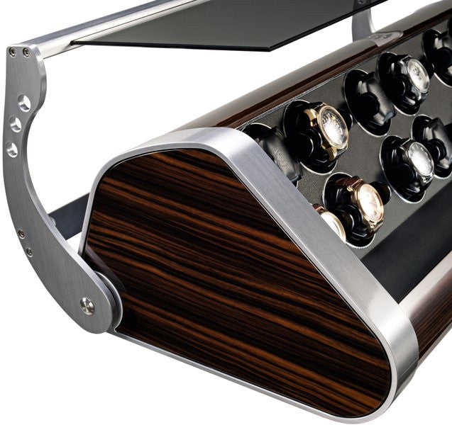 The REVOLUTION Collection from the House of BUBEN & ZORWEG is an 12-unit watch winding system made of superior German craftmanship. The REVOLUTION 12 is composed of an aluminum frame with an exterior of exotic glossy macassar wood. Your timepieces are on full display with state of the art LED lighting system with fade function, under a crystal glass hood secured with a German-made safety lock. Covered with the finest Italian Nappa leather interior, a push button LCD panel will program your watch winder with three winding cycles, a sleep phase mode, fast wind option and preferred rotational direction. Powered by a power adapter with an optional add-on presentation column or hi-fidelity base column to make a striking impact in any room interior décor .