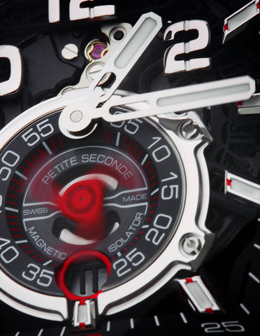 • Skeletonized black & silver tourbillon style sub-seconds dial with red accents with red trimmed date window within