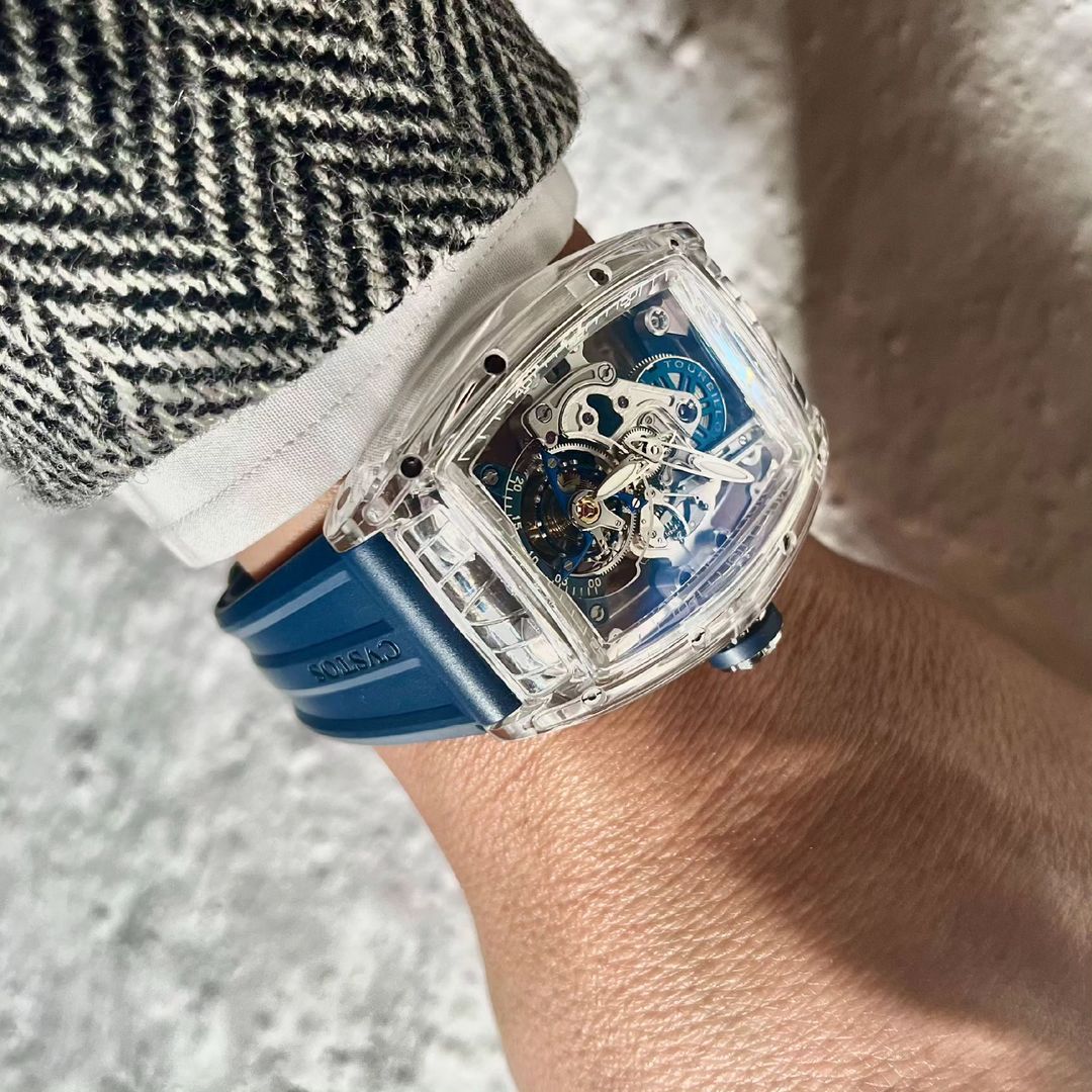 The Sealiner PS Challenge Sapphire Series is a limited edition collection with just 25 pieced produced each in 5 variations. The sapphire crystal 41mm signature tonneau shaped case with clear bezel is bestowed with decorative silver screws. The blue accented teakwood plate has see-through three-dimensional dial with open frame design displaying partial polished rhodium-plated Côtes de Genève rotor movement. Polished curved Super-Luminova indices surround polished skeletonized leaf-shape chrome hands. A date window sits within a tourbillon sub-seconds dial with red, white and blue accents under a curved anti-reflective sapphire crystal. Equipped with a polished screw-down crown with easy-grip rubberized bumper with 100 meter water resistance rating. Powered by CVSTOS own in-house Swiss-made automatic movement caliber CVS410 viewable behind the exhibition case-back. Fitted with a streamlined rubber strap with brushed adjustable bi-fold deployant clasp with CVSTOS insignia.