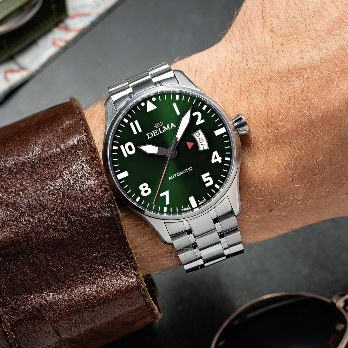 Inspired by dashboard instruments in classic and modern aircrafts, the Commander Series is a statement piece that displays the same essential details as early pilot watches but with modern design elements. The Commander Automatic, part of the Aero Collection from DELMA, features extra bold accents within a 45mm stainless steel case and generous sized fluted corrugated crown with 50 meter water resistance rating. Easily legible, behind a anti-reflective sapphire crystal the green sun-brushed dial has applied bold luminous Arabic numerals and markers. Prominently displayed is the open date window wheel with red arrow shaped indicator marker that sits behind an anti-reflective sapphire crystal. Black luminous dagger shaped hands with red accented central seconds are surrounded by a minutes track on outer dial disc. Powered by automatic caliber SW200 movement with DELMA's own custom rotor and 38 hour power reserve viewable within the exhibition case-back. Fitted with a polished and brushed stainless steel 5-link bracelet with security fold-over deployment clasp to secure in place.