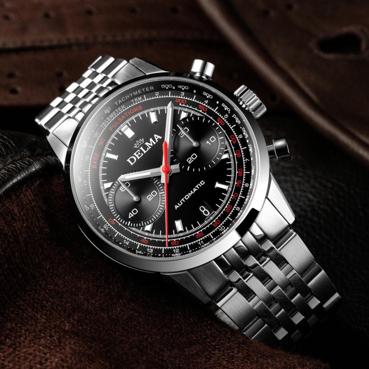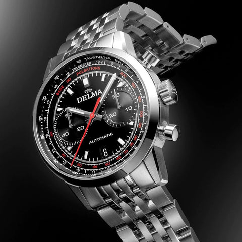 The Continental Pulsometer timepiece collection from the DELMA brand, reimagines vintage 1960s style with modern innovations, sporty details mixed with quality finishes. Featuring a pulsometer to measure heart rate, telemeter, and tachymeter to measure speed on outer dial disc. The 42mm stainless steel case has a black sun-ray brushed dial with guilloche patterned sub-seconds, and 30-minute sub-dial complete with date window @3. Large luminous indices surrounded by a minutes track, tachymeter and pulsometer on outer dial disc makes it easily legible for precision timing.  Super-lumiNova pencil shaped hands with prominent red central seconds sit behind an anti-reflective sapphire crystal. The sturdy robust polished chronograph pushers sit between the 100 meter water resistant easy-grip screw-down crown. Powered by automatic chronograph SW510 bicompax movement with DELMA's own custom rotor and 48 hour power reserve is viewable within the exhibition case-back. Fitted with a polished and brushed stainless steel 7-link bracelet with security fold-over deployment clasp to secure in place.