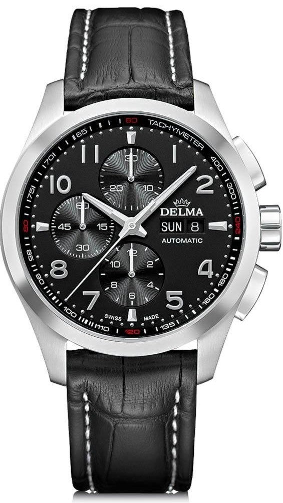 DELMA's signature Klondike Collection epitomizes mastery in design and craftsmanship creating exquisite timepieces with sophisticated functions and intricate decorations. The 44mm stainless steel case has a black sun-ray brushed dial with guilloche patterned sub-seconds, 12-hour, and 30-minute sub-dial counter. Large applied silver Arabic numerals and indices are surrounded by a minutes and tachymeter track on outer dial disc for easy legibility. Super-lumiNova pencil shaped hands with central seconds and prominent day/date window sit behind an anti-reflective sapphire crystal. A screw-down stainless steel crown with 200 meter water resistance is positioned between generous sized polished chronograph pushers. Powered by automatic chronograph ETA Valjoux 7750 movement with DELMA's own custom rotor and 48 hour power reserve viewable within the exhibition case-back. Fitted with a black alligator grained calf-skin leather strap with white contrasting stitch and polished stainless steel butterfly deployant clasp to secure in place.