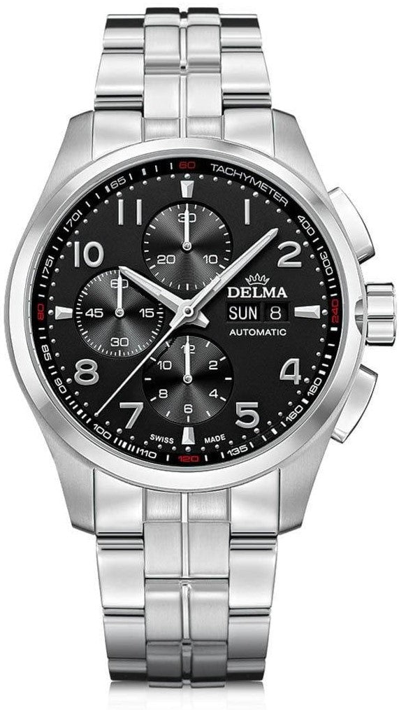 DELMA's signature Klondike Collection epitomizes mastery in design and craftsmanship creating exquisite timepieces with sophisticated functions and intricate decorations. The 44mm stainless steel case has a black sun-ray brushed dial with guilloche patterned sub-seconds, 12-hour, and 30-minute sub-dial counter. Large applied silver Arabic numerals and indices are surrounded by a minutes and tachymeter track on outer dial disc for easy legibility. Super-lumiNova pencil shaped hands with central seconds and prominent day/date window sit behind an anti-reflective sapphire crystal. A screw-down stainless steel crown with 200 meter water resistance is positioned between generous sized polished chronograph pushers. Powered by automatic chronograph ETA Valjoux 7750 movement with DELMA's own custom rotor and 48 hour power reserve viewable within the exhibition case-back. Fitted with a polished and brushed stainless steel link bracelet with security fold-over deployment clasp to secure in place.