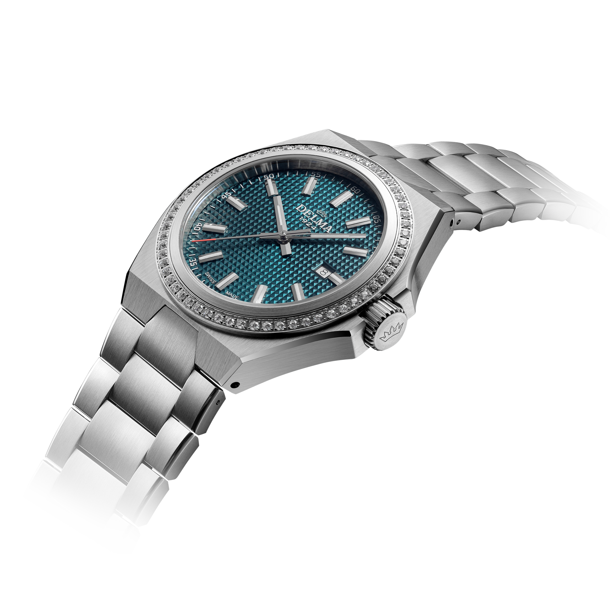Meeting the demands of the modern wearer, DELMA's Midland Collection is inspired by a look back in time with bold geometric shapes incorporating a new integrated bracelet. Midland was one of the initial four brands used by DELMA’s founder in the 1920’s and also takes its namesake from a model in the 1980’s. Now available in a smaller version, the 34mm brushed stainless steel tonneau shaped case features a diamond encrusted polished fixed bezel. Teal blue guilloche pyramid pattern dial is surrounded by 60 genuine diamonds. Applied Super-LumiNova indices with date window @3 sit behind an anti-reflective sapphire crystal. Luminous baton shaped hands with red tipped central seconds are surrounded by a minutes track. Fitted with a polished and brushed integrated stainless steel 3-link bracelet with security fold-over push button deployment clasp to secure in place.