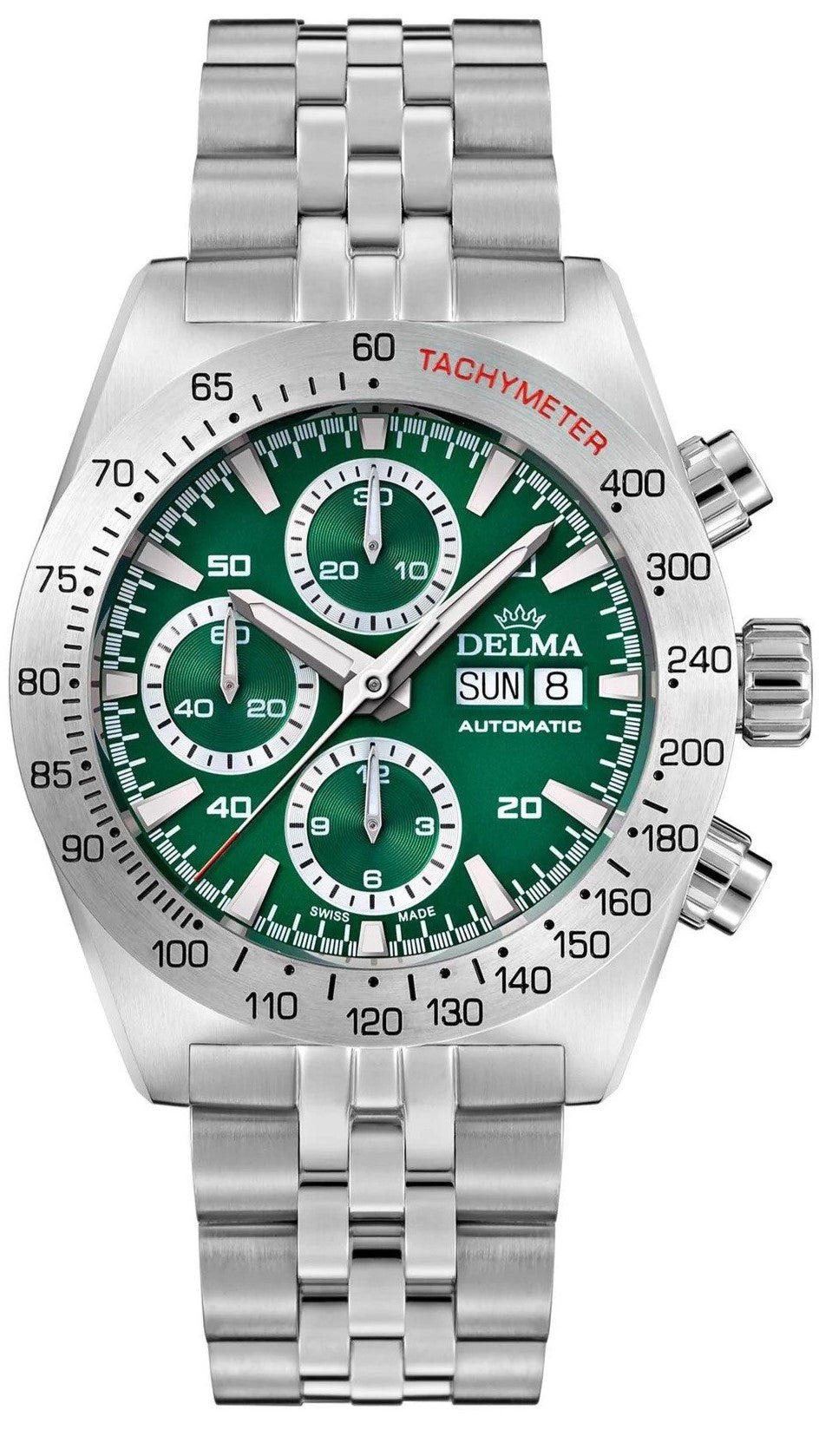 The Montego Series from DELMA's Racing Collection combines refined style with enhanced functionality featuring a prominent Tachymeter chronograph, distinguishing itself as a venerable racing timepiece. The 42mm stainless steel case has a green sun-ray brushed dial with guilloche patterned sub-seconds, 12-hr and 30-minute sub-dial. Large luminous indices surrounded by a minutes track and big day/date window @3 makes it easily legible for precise timing.  Super-lumiNova pencil shaped hands with red tipped central seconds sit behind an anti-reflective sapphire crystal. The sturdy robust brushed stainless steel Tachymeter bezel is operated by polished pusher set between the 200 meter water resistant easy-grip screw-down crown. Powered by automatic SW500 movement with DELMA's own custom rotor with an impressive 62 hour power reserve is viewable within the exhibition case-back. Fitted with a polished and brushed stainless steel 3-link bracelet with security fold-over deployment clasp to secure in place.