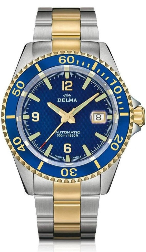 The Santiago Collection from the DELMA brand comes in many variations of colors and features to choose from, making it not only an excellent diving watch but stylish as well.  has The 43mm two-tone stainless steel case model: 52701.560.6.044 features a blue carbon weave textured dial under a scratch resistant anti-reflective sapphire crystal. Large applied Arabic numerals and luminous geometric indices with super-lumiNova sword shaped hands are easily legible in the deepest depths of the ocean. Equipped with a brushed golden PVD coated stainless steel coin-edge unidirectional blue diving bezel with magnified date window @3 surrounded by a minutes track on outer dial disc.  A stainless steel crown-guard encases the ridged robust easy-grip screwed-down PVD coated crown with 500 meter water resistance rating. Powered by automatic SW 200-1 movement with DELMA's own custom rotor and a 38 hour power reserve viewable within the exhibition case-back. Fitted with a two-tone polished and brushed stainless steel 3-link bracelet with gold PVD coated central link center secured with a fold-over deployment clasp.