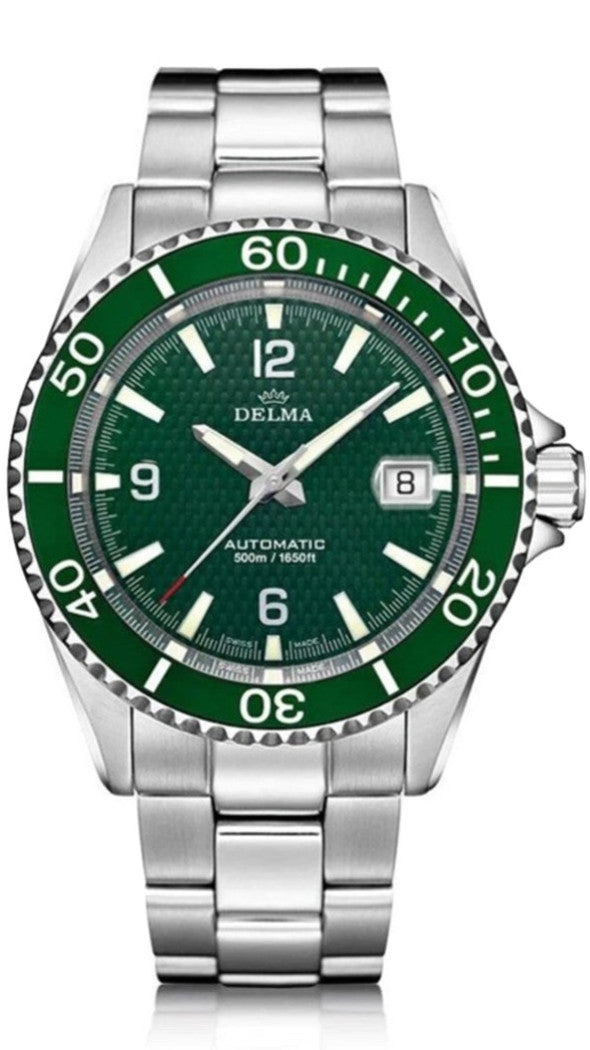 The Santiago Collection from the DELMA brand comes in many variations of colors and features to choose from, making it not only an excellent diving watch but stylish as well.  The 43mm stainless steel case model: 41701.562.6.144 features a green carbon weave textured dial under a scratch resistant anti-reflective sapphire crystal. Large applied Arabic numerals and luminous geometric indices with super-lumiNova sword shaped hands are easily legible in the deepest depths of the ocean. Equipped with a brushed anodized aluminum coin-edge unidirectional green diving bezel with magnified date window @3 surrounded by a minutes track on outer dial disc. A stainless steel crown-guard encases the ridged robust easy-grip screwed-down crown with 200 meter water resistance rating. Fitted with a polished and brushed stainless steel 3-link bracelet with security fold-over deployment clasp to secure in place.